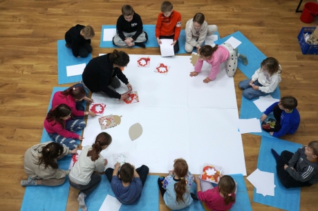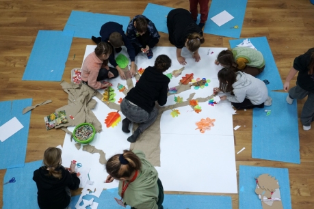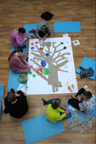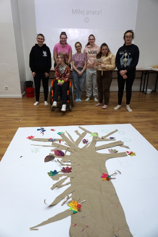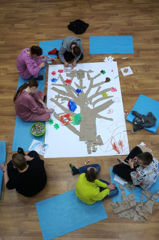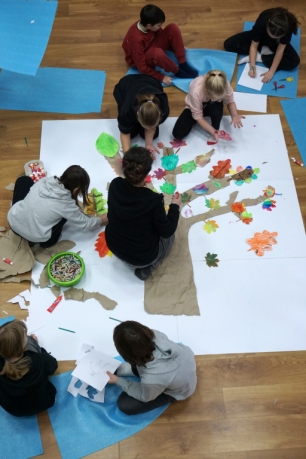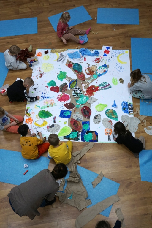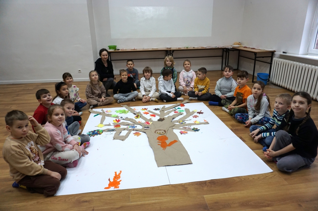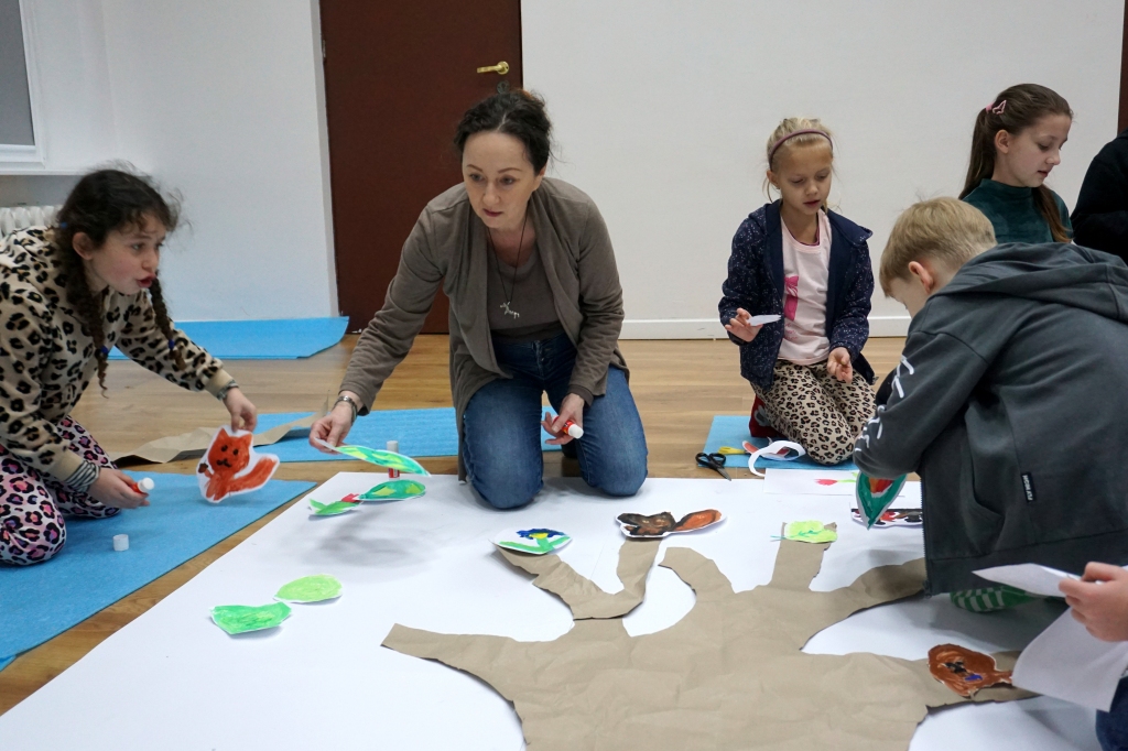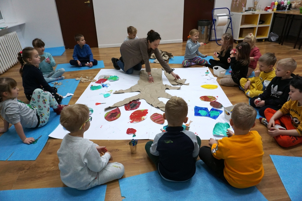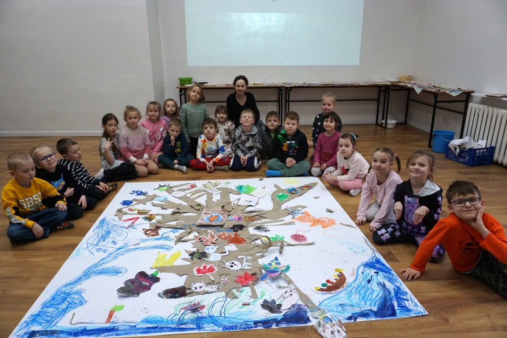 Po krótkim wprowadzeniu, dzieci namalowały indywidualnie detale potrzebne do stworzenia fantastycznego drzewa. Następnie wykleiły na dużym formacie pień oraz gałęzie drzewa i dzieci zajęły się kompozycją, przyklejając przygotowane wcześniej elementy.