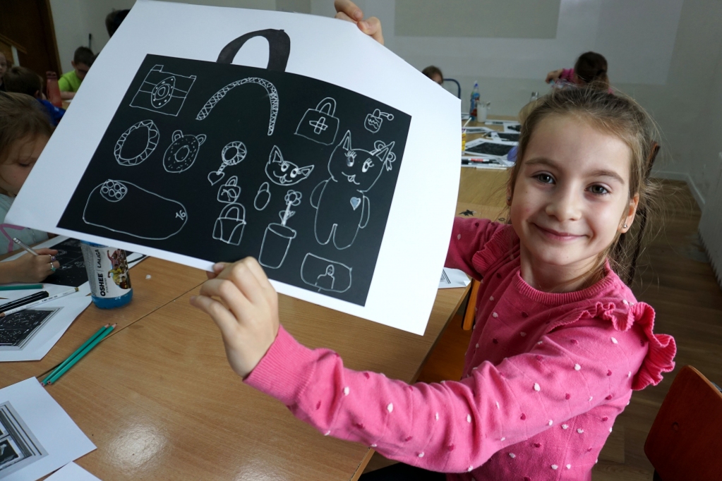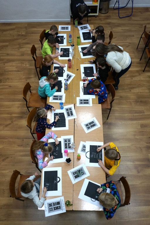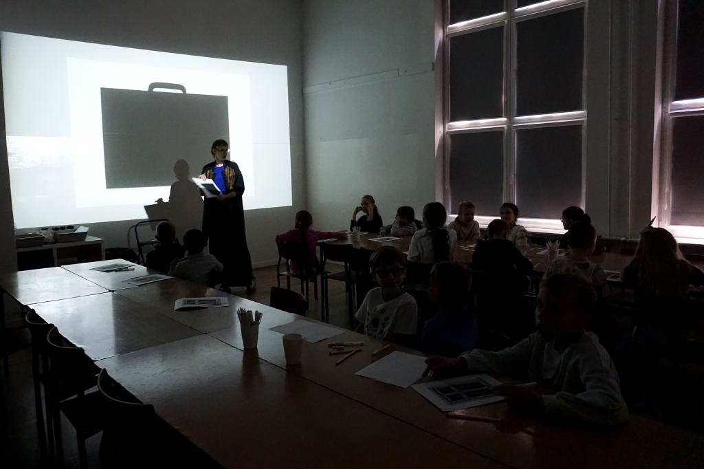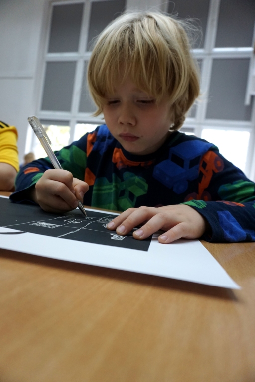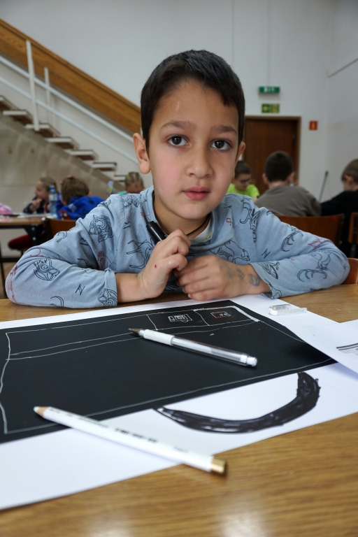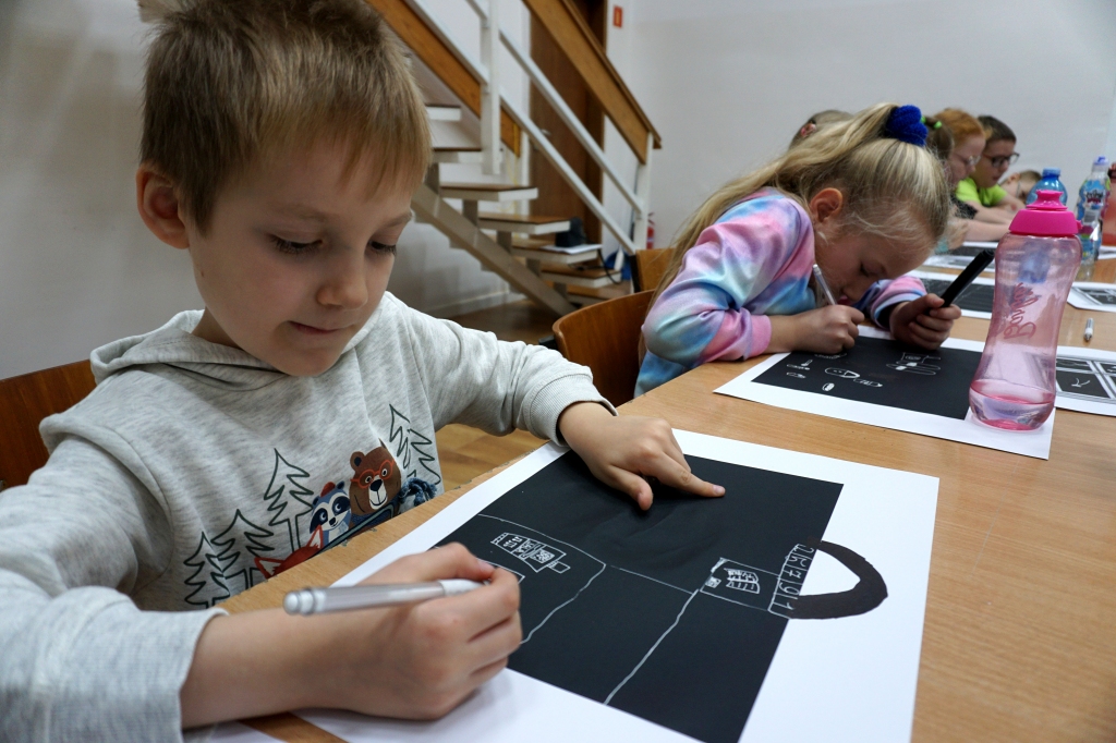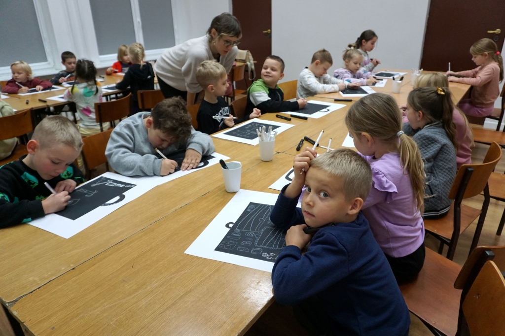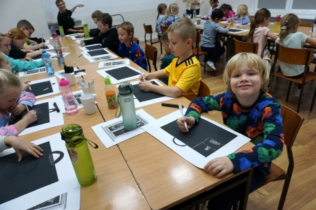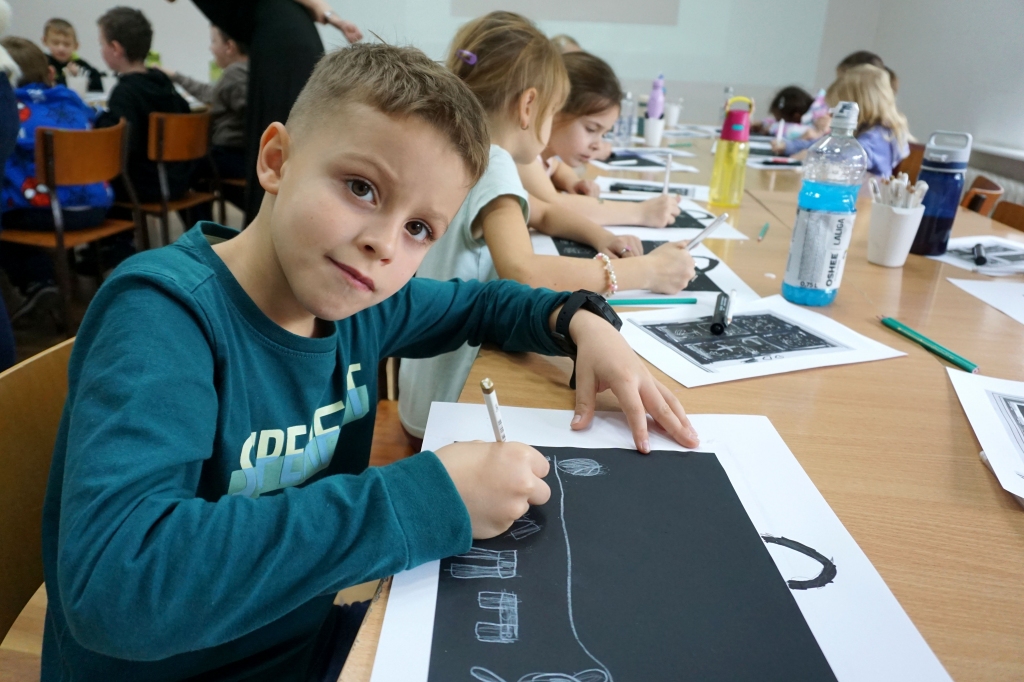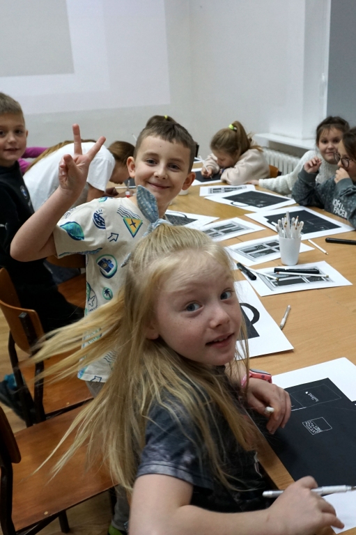 Podczas zajęć zajęliśmy się pojęciami negatywu i rysunku negatywowego. Dzieci wykonały 2 proste ćwiczenia rysunkowe rozwijające ich wyobraźnię i umiejętności rysunkowe. Zobaczyły jak w rysunku można wydobywać światło z ciemnego obszaru, rysując białym narzędziem po czarnej powierzchni. Miały również okazję pracować różnymi narzędziami rysunkowymi.