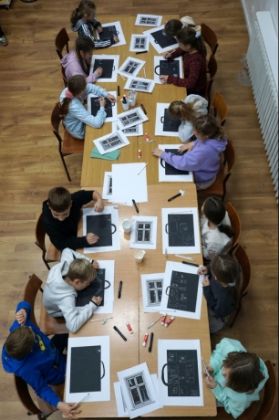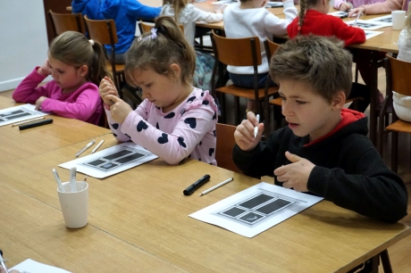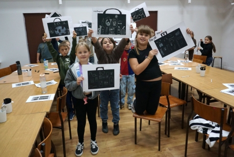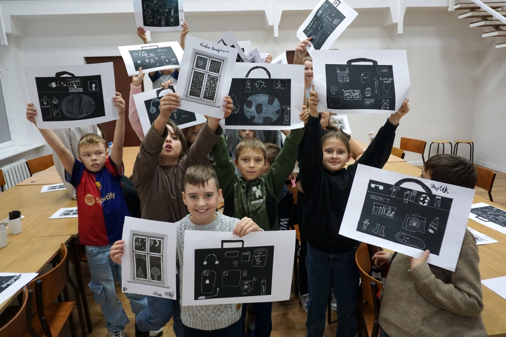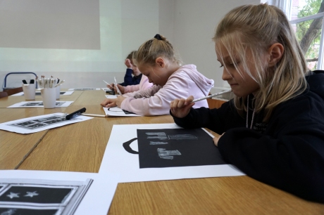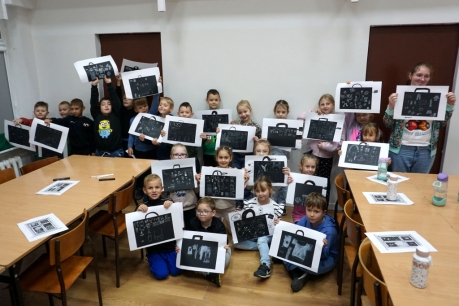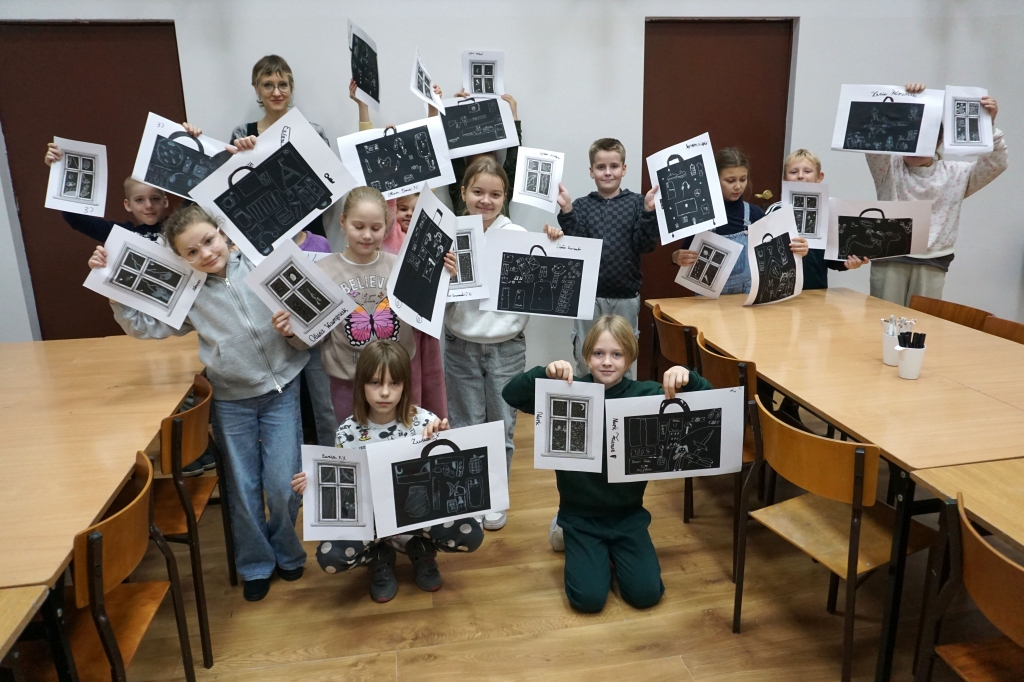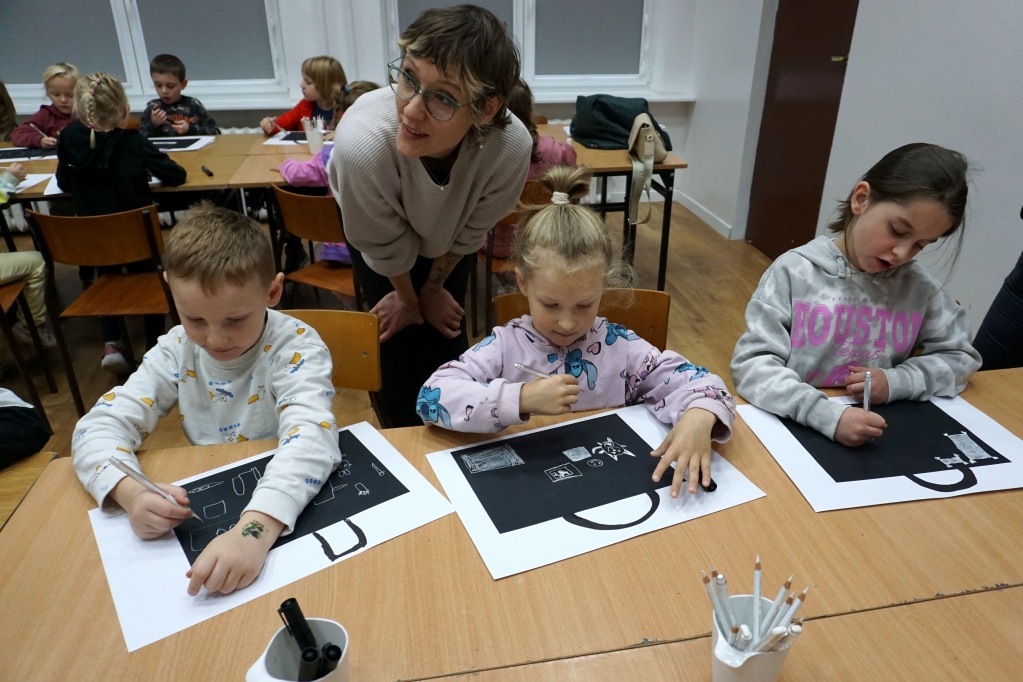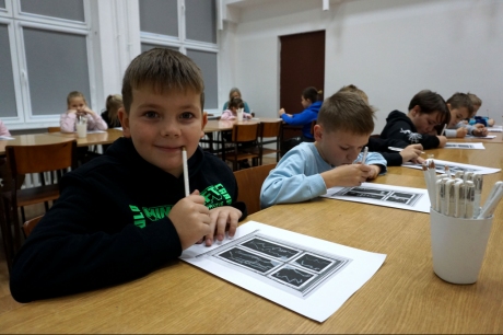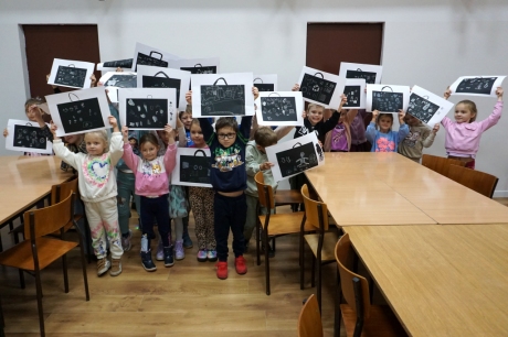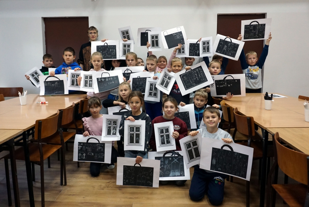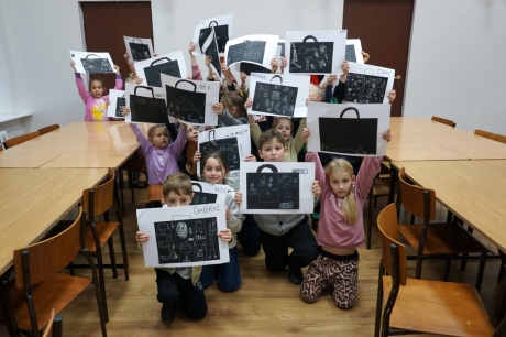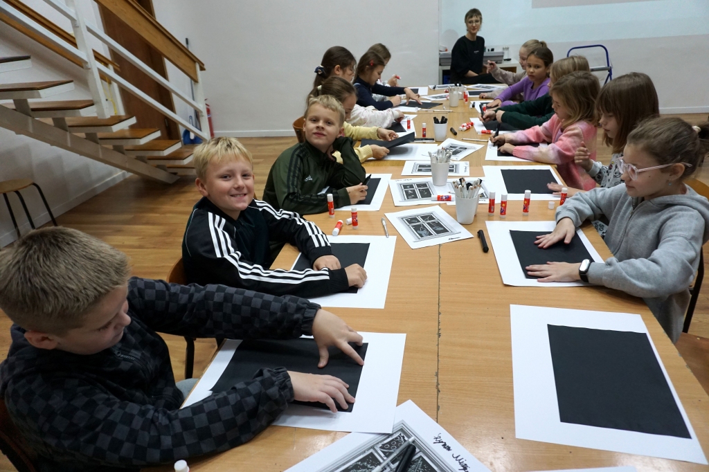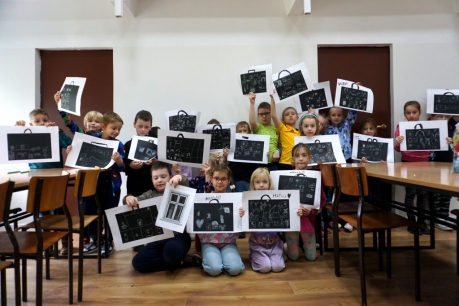 Podczas zajęć zajęliśmy się pojęciami negatywu i rysunku negatywowego. Dzieci wykonały 2 proste ćwiczenia rysunkowe rozwijające ich wyobraźnię i umiejętności rysunkowe. Zobaczyły jak w rysunku można wydobywać światło z ciemnego obszaru, rysując białym narzędziem po czarnej powierzchni. Miały również okazję pracować różnymi narzędziami rysunkowymi.
