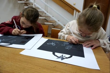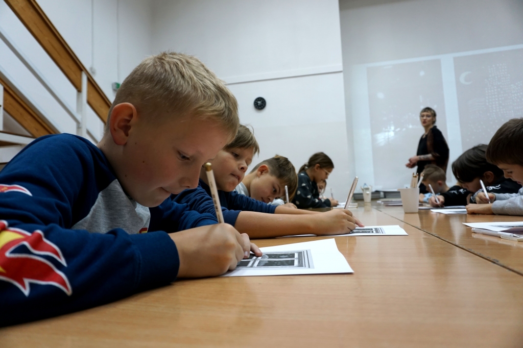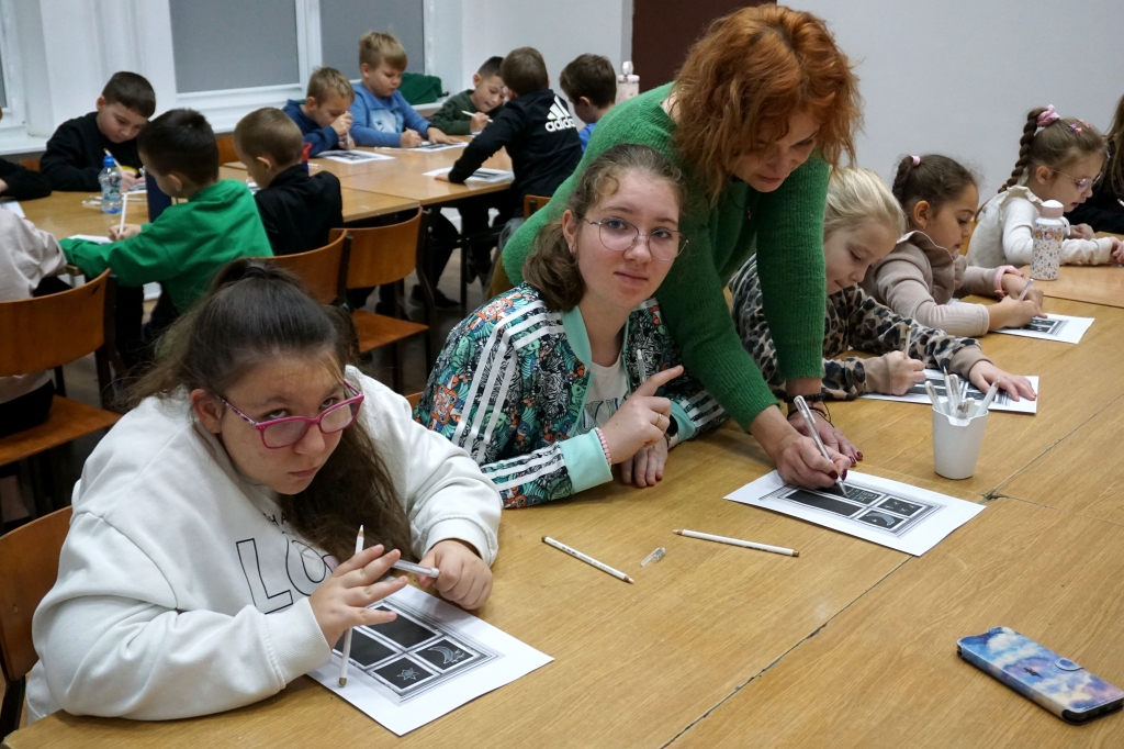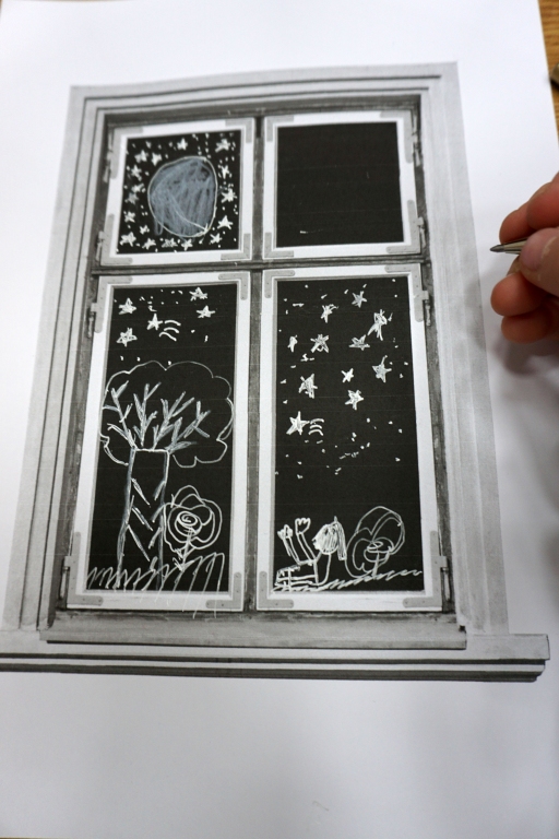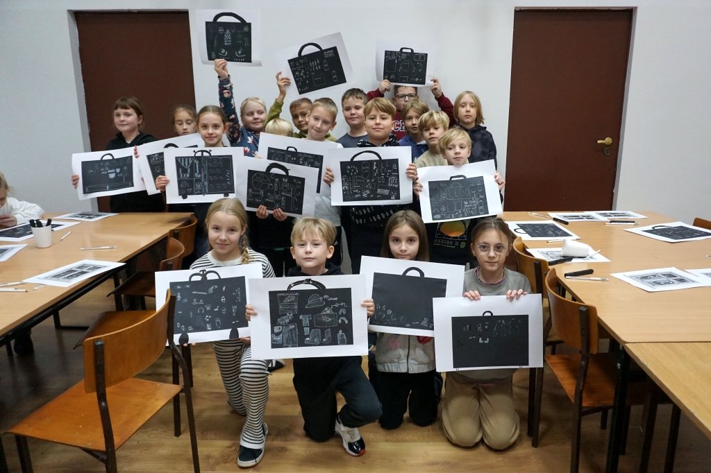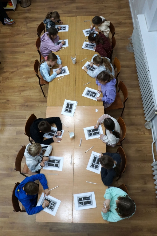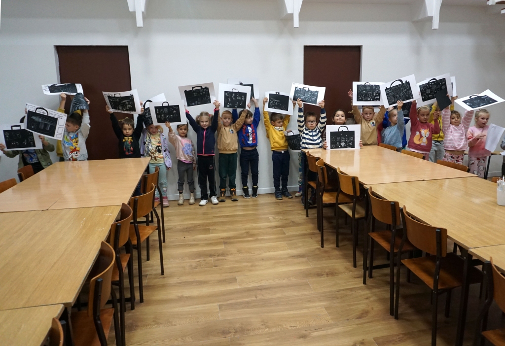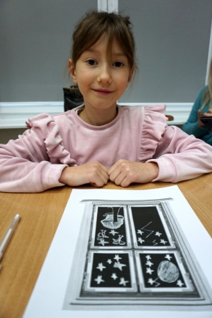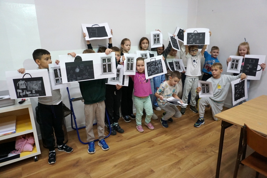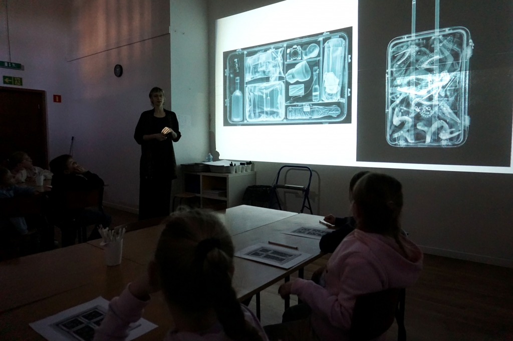 Podczas zajęć zajęliśmy się pojęciami negatywu i rysunku negatywowego. Dzieci wykonały 2 proste ćwiczenia rysunkowe rozwijające ich wyobraźnię i umiejętności rysunkowe. Zobaczyły jak w rysunku można wydobywać światło z ciemnego obszaru, rysując białym narzędziem po czarnej powierzchni. Miały również okazję pracować różnymi narzędziami rysunkowymi.