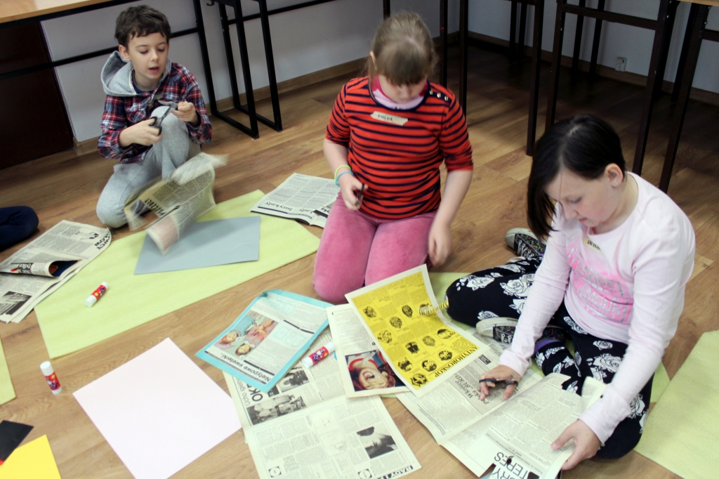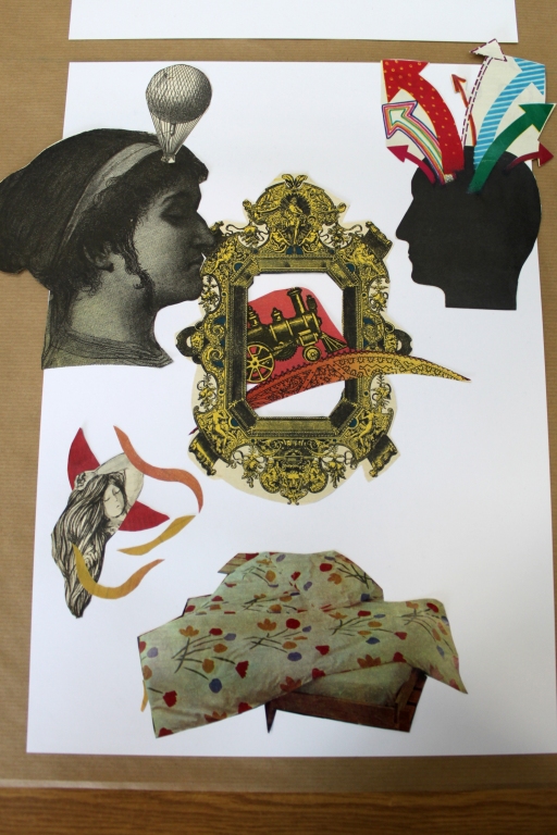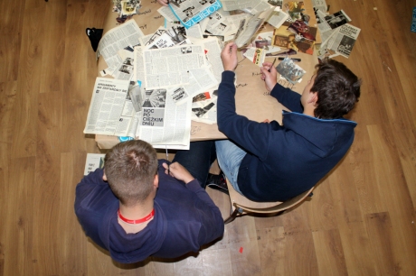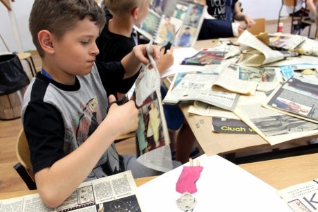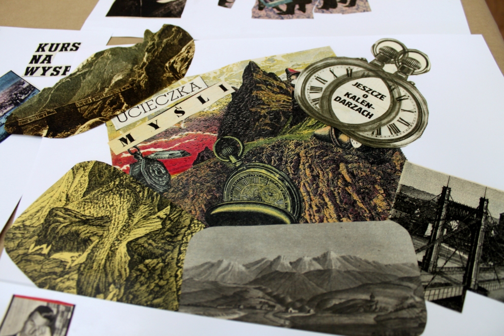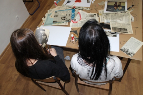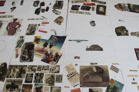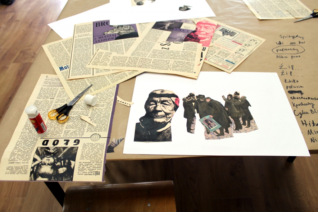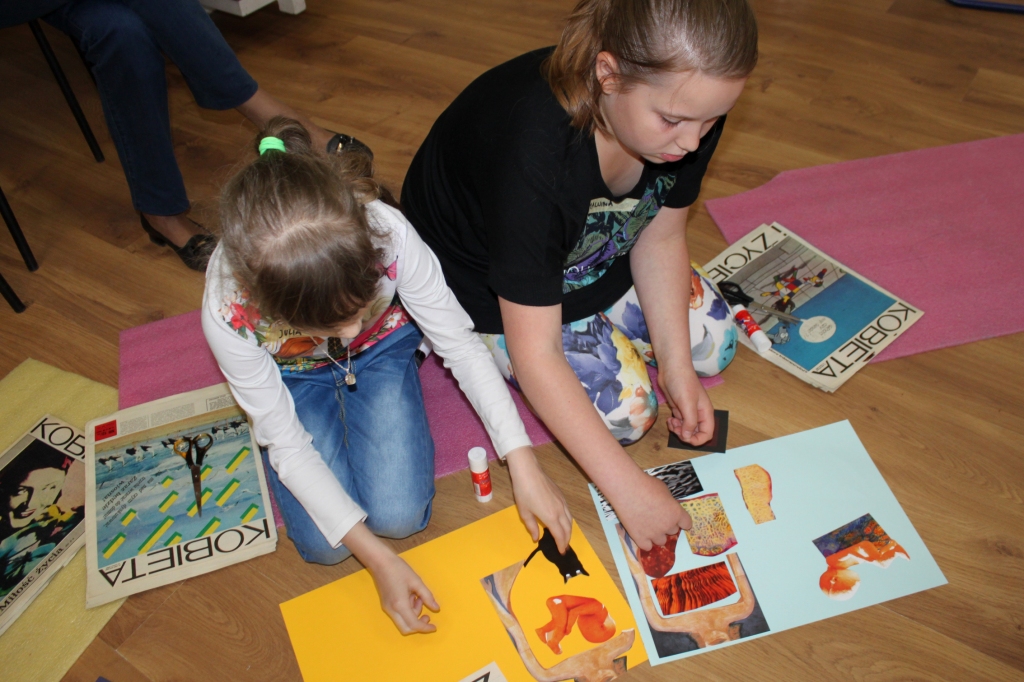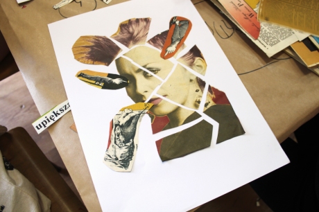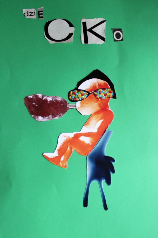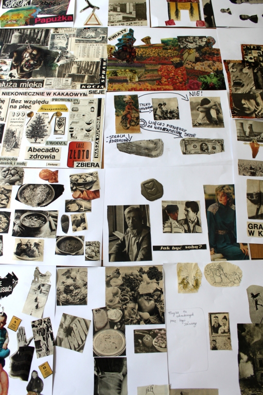 Warsztaty rozpoczęliśmy od napisania wielu słów, które nam przychodzą do głowy. Następnie każdy wybrał jedno, które przedstawił w wizualny sposób, używając zdjęć znalezionych w gazetach. Powstałe fotomontaże/kolaże pokazały takie słowa jak m.in.: opieka, wow, rodzina, sen.
