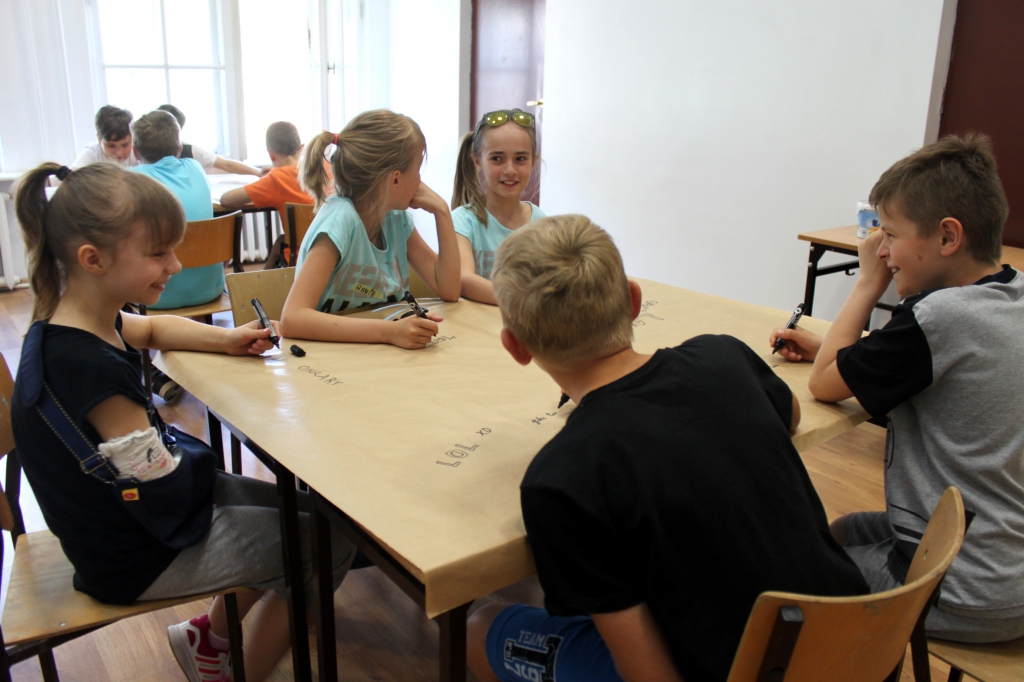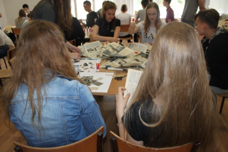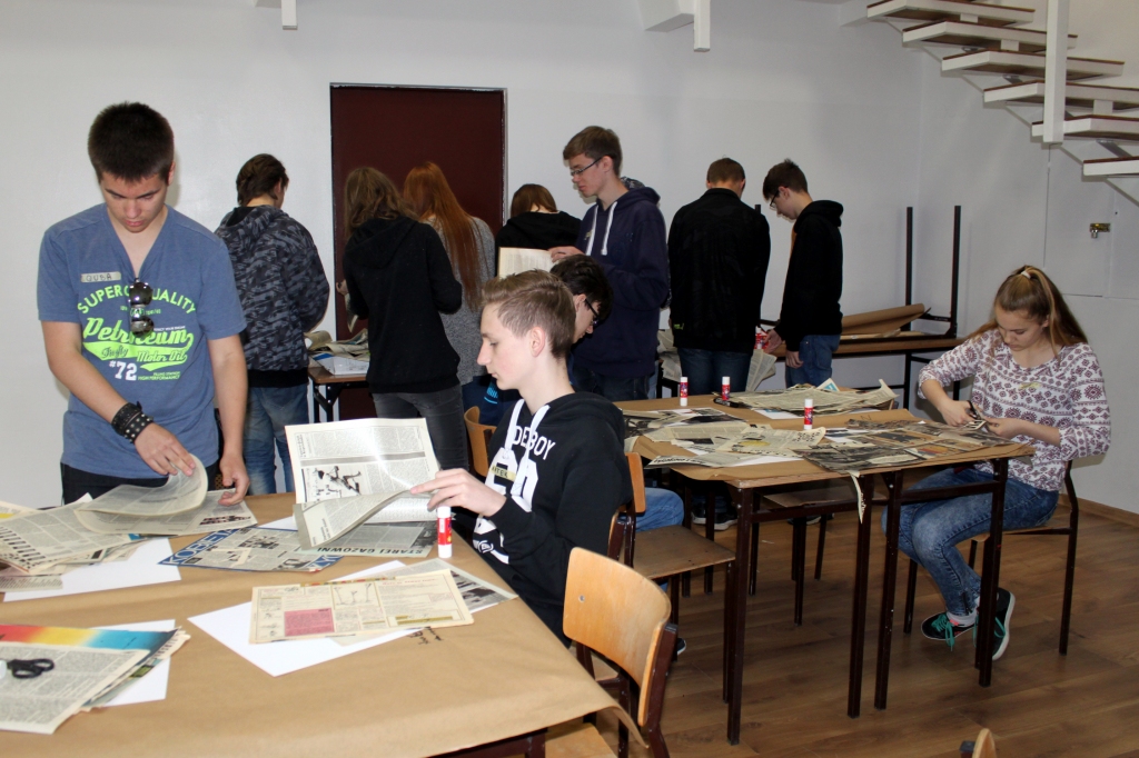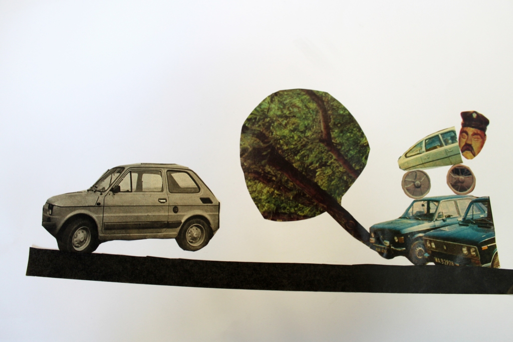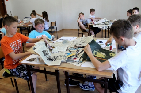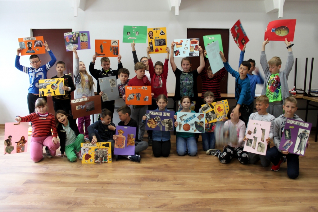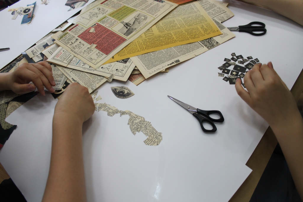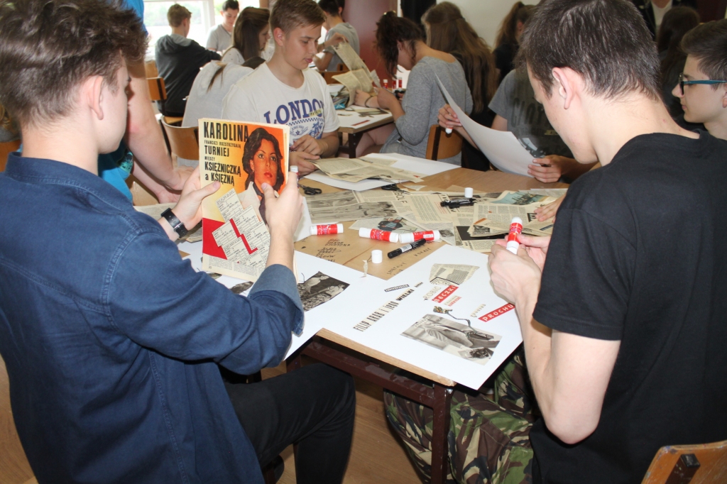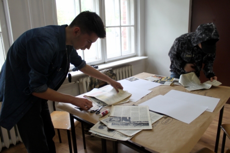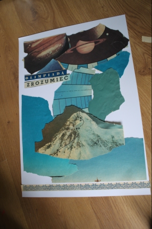 Warsztaty rozpoczęliśmy od napisania wielu słów, które nam przychodzą do głowy. Następnie każdy wybrał jedno, które przedstawił w wizualny sposób, używając zdjęć znalezionych w gazetach. Powstałe fotomontaże/kolaże pokazały takie słowa jak m.in.: opieka, wow, rodzina, sen.