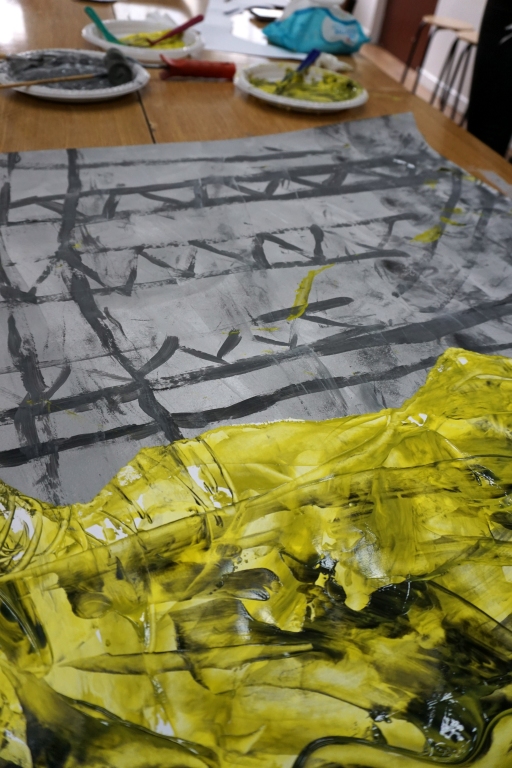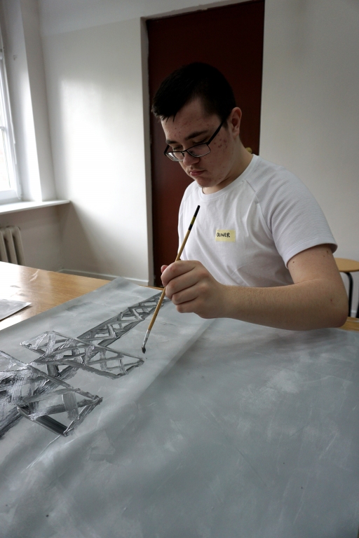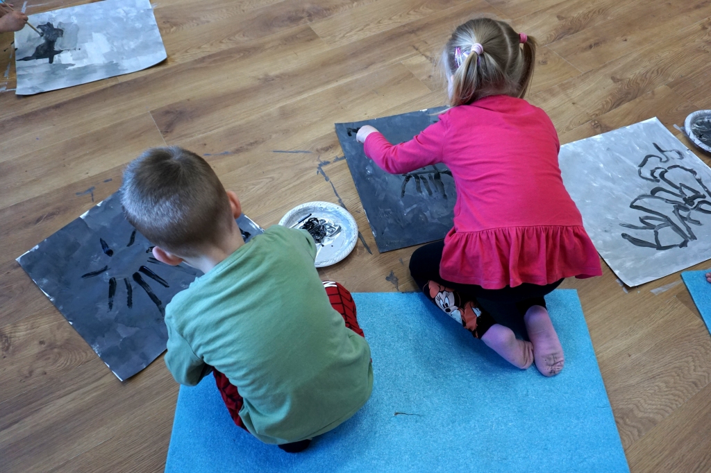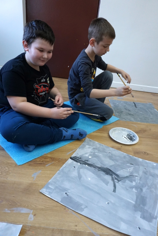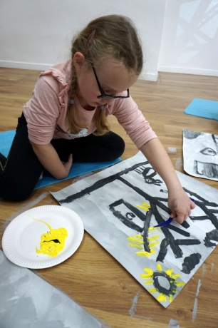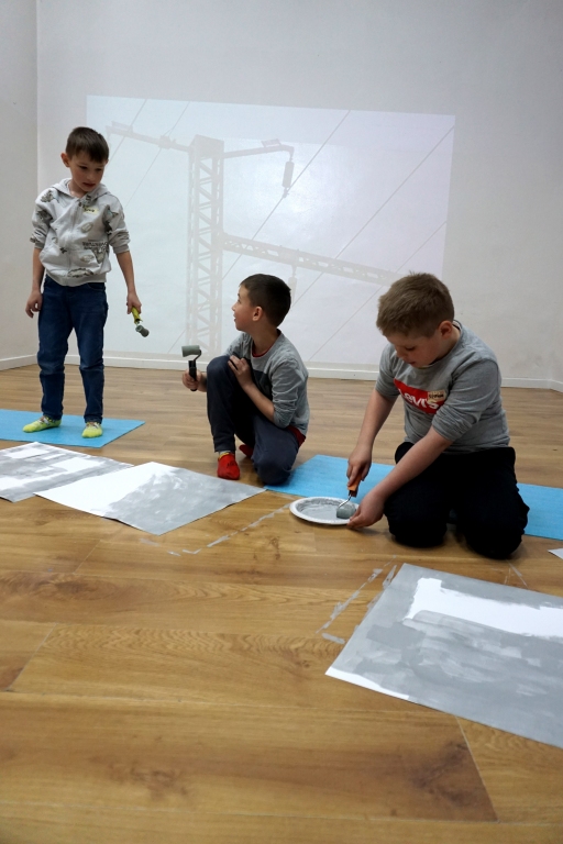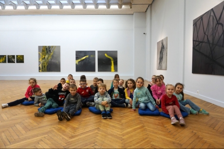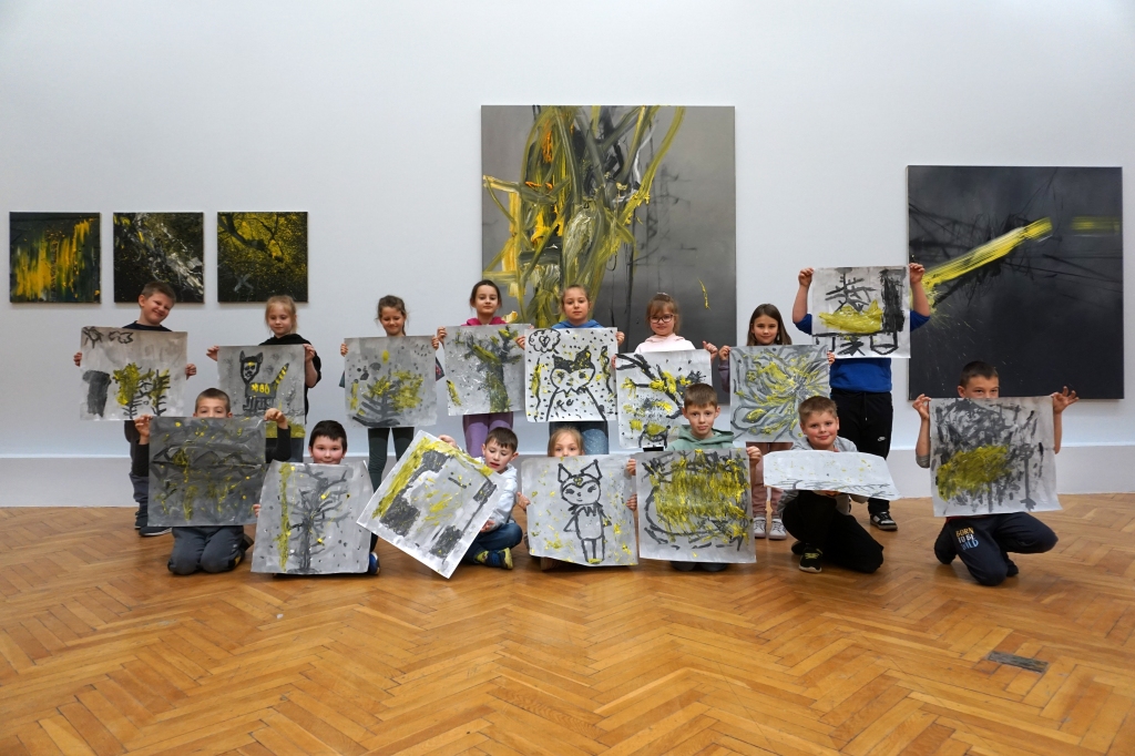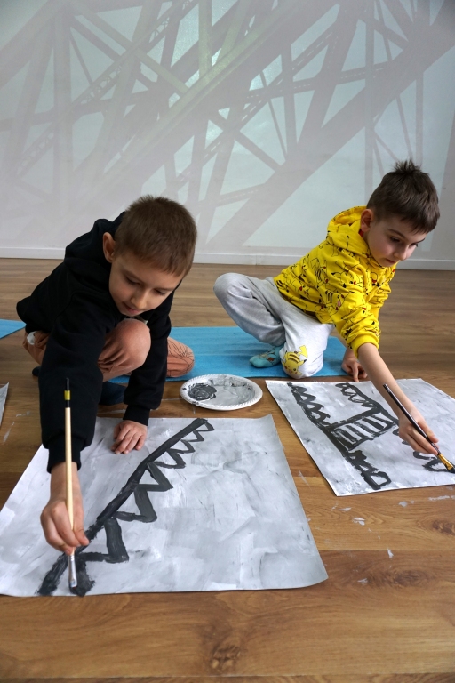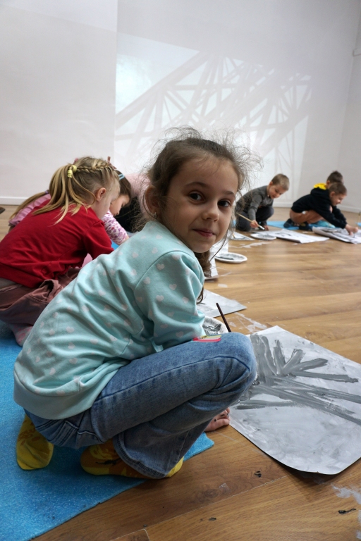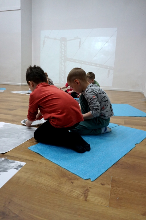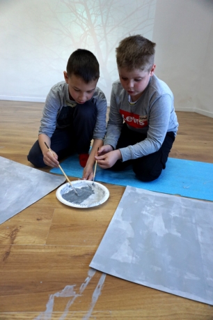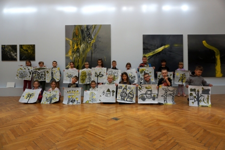 Podczas kolejnych warsztatów SZTUKowanie uczestnicy zwiedzili wystawę Andrzeja Bembenka. Poznali termin abstrakcja, malarstwo ekspresjonistyczne, impast oraz akcent. Następnie stworzyli swoje dzieła malarskie przedstawiające linearne fragmenty naszeg krajobrazu: drzewa, linie wysokiego napięcia, żurawie, mosty, trakcje. Używali do tego celu różnych narzędzi malarskich: wałka, pędzla i szpachelki, którą stworzyli impastowy akcent na obrazie.