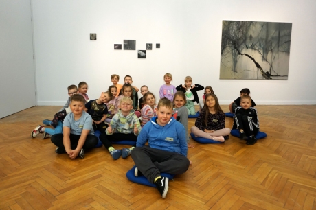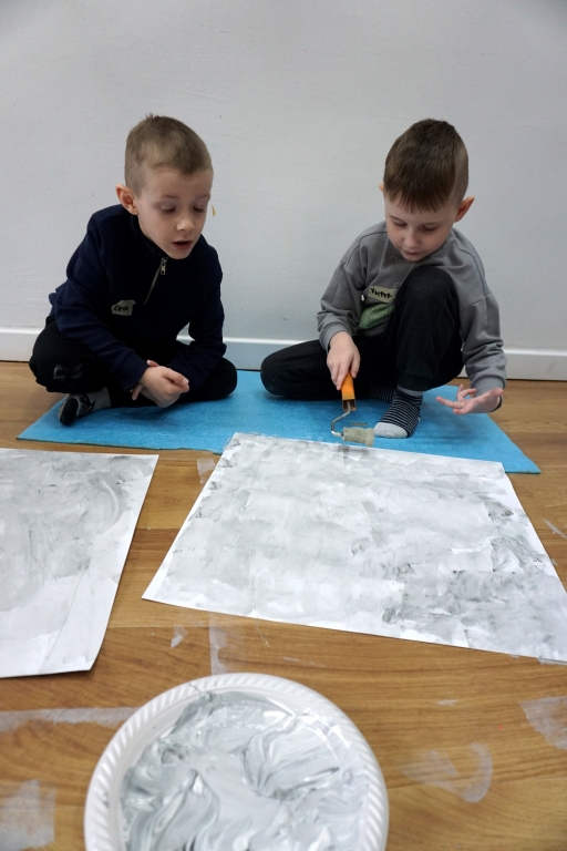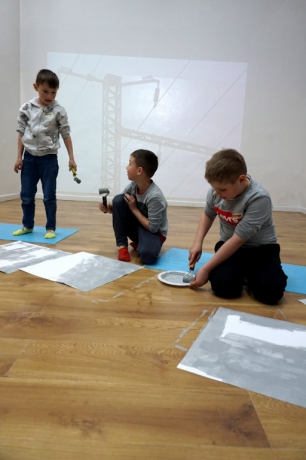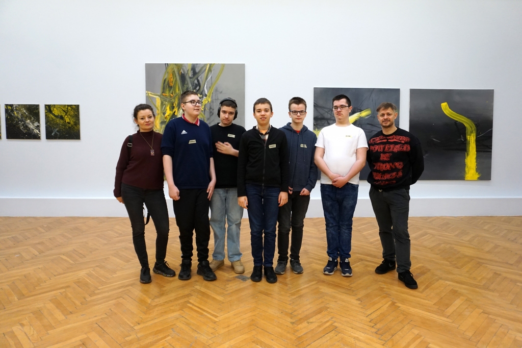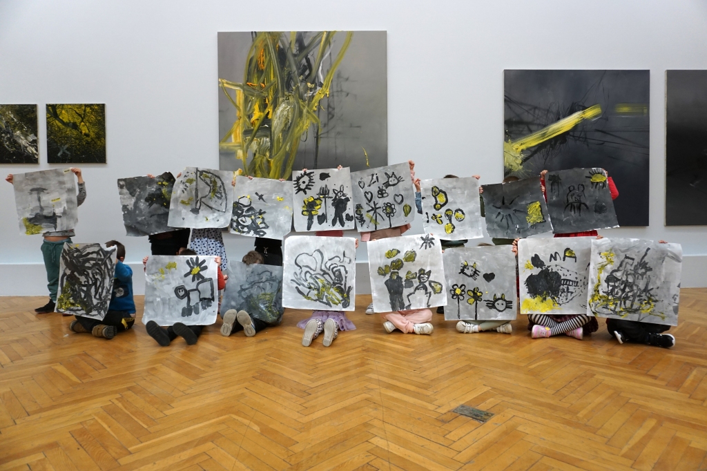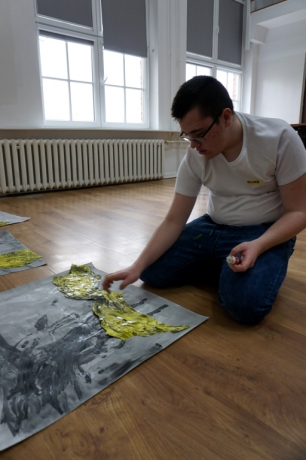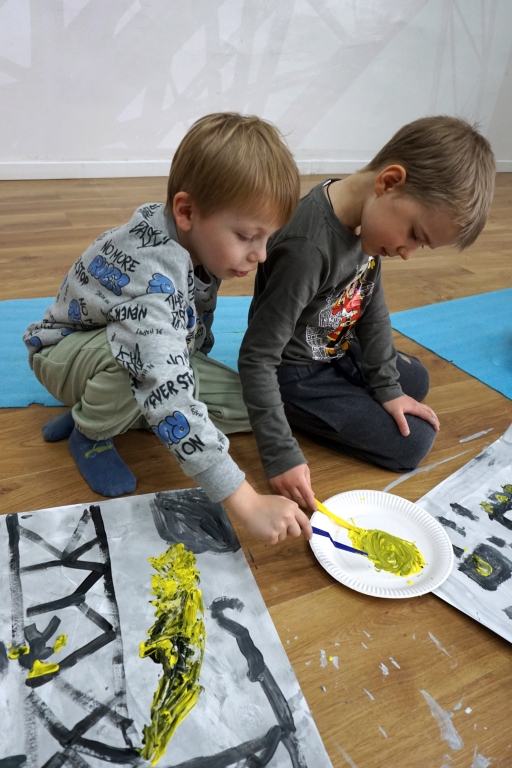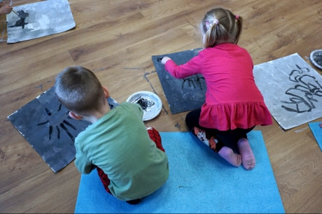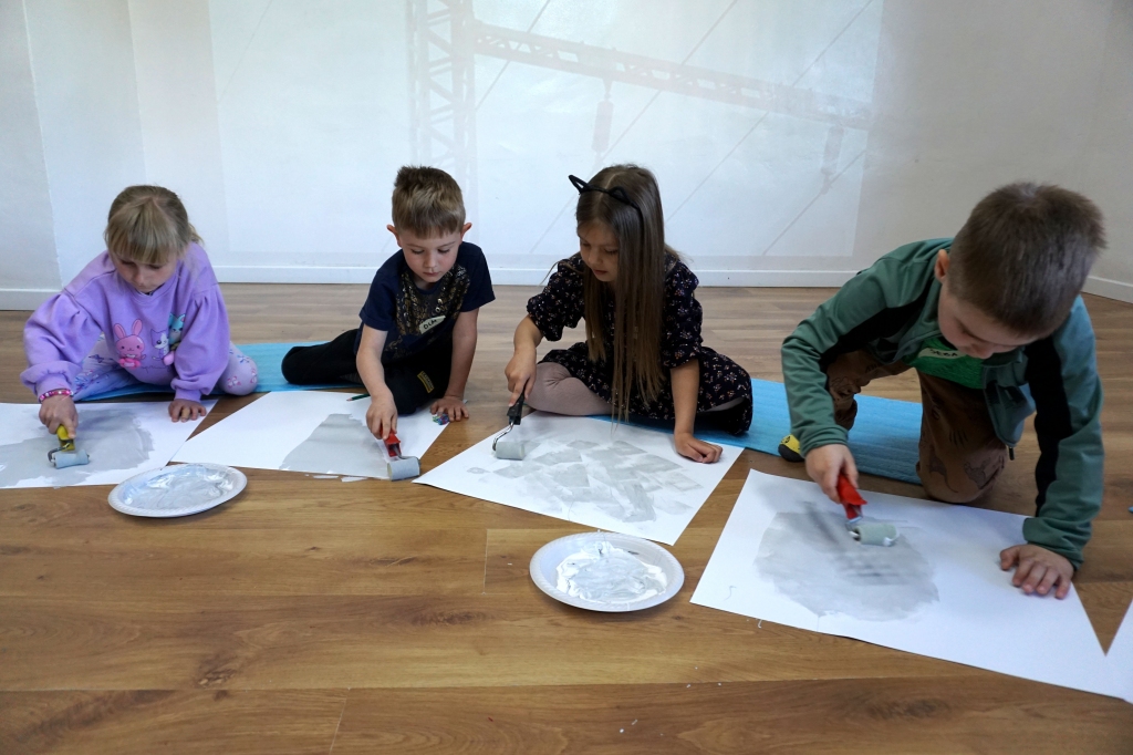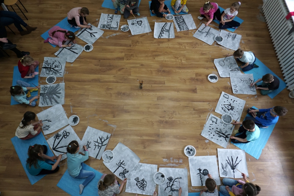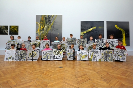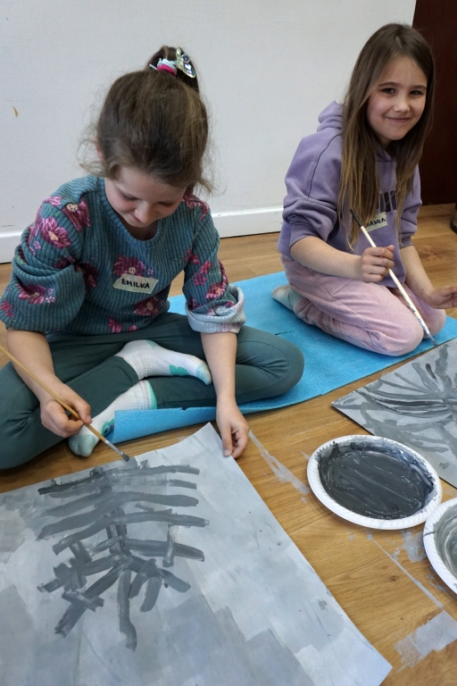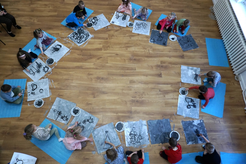 Podczas kolejnych warsztatów SZTUKowanie uczestnicy zwiedzili wystawę Andrzeja Bembenka. Poznali termin abstrakcja, malarstwo ekspresjonistyczne, impast oraz akcent. Następnie stworzyli swoje dzieła malarskie przedstawiające linearne fragmenty naszeg krajobrazu: drzewa, linie wysokiego napięcia, żurawie, mosty, trakcje. Używali do tego celu różnych narzędzi malarskich: wałka, pędzla i szpachelki, którą stworzyli impastowy akcent na obrazie.