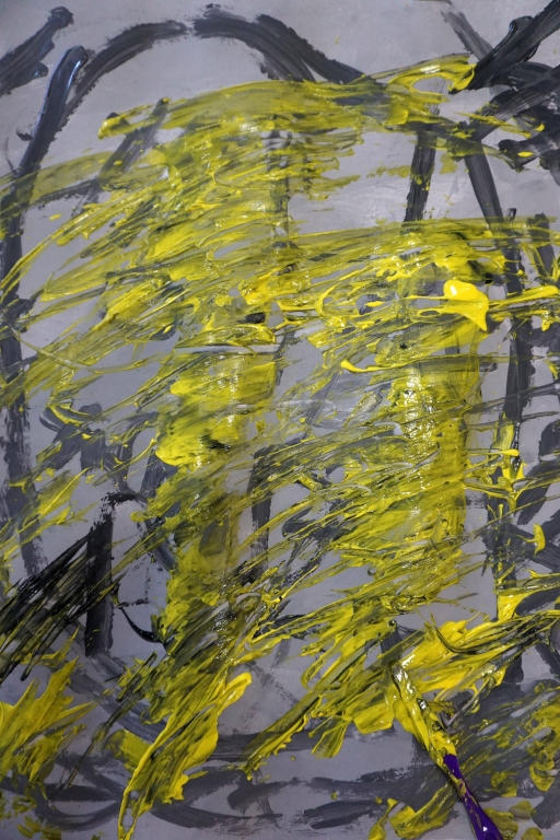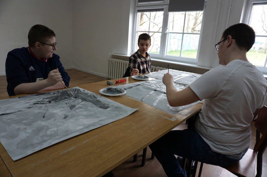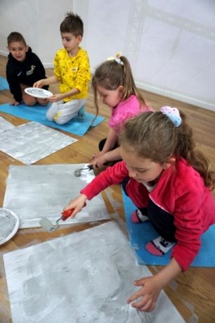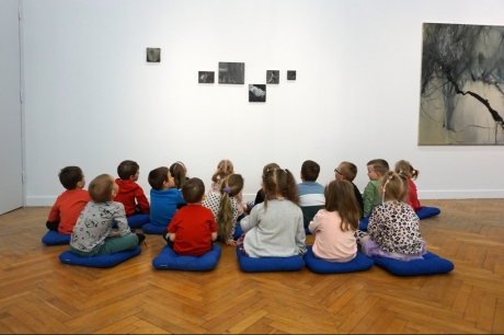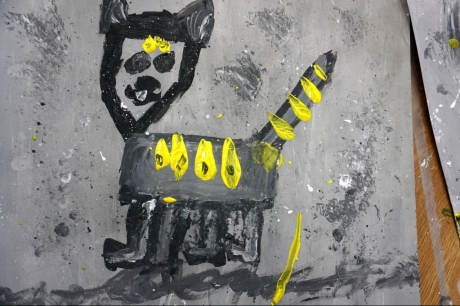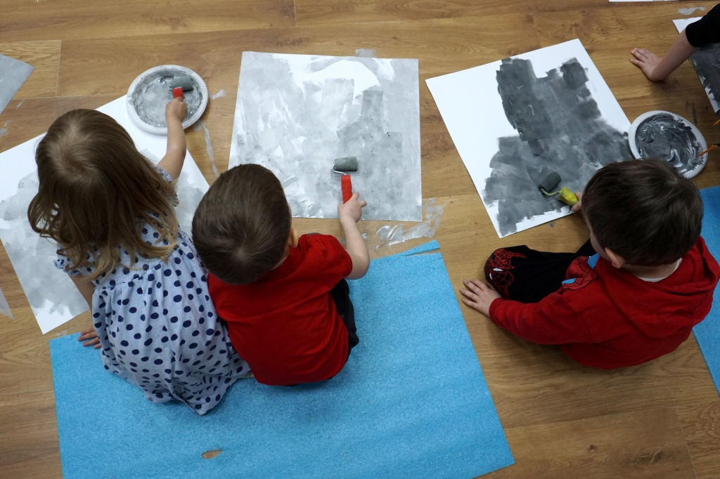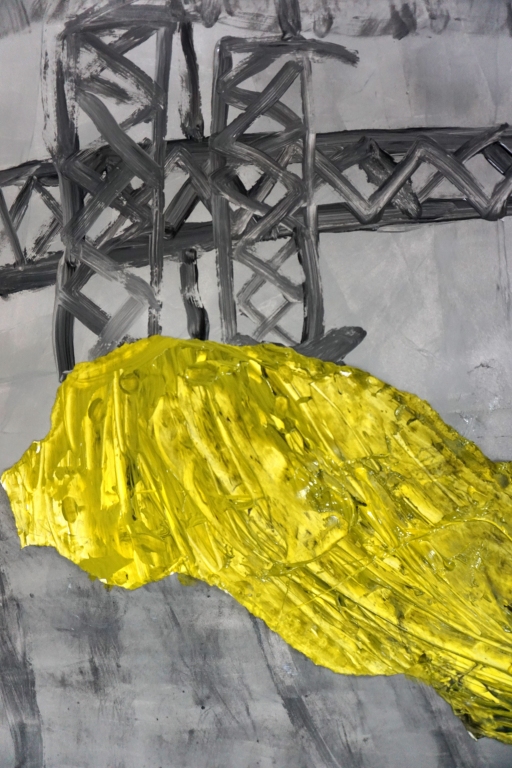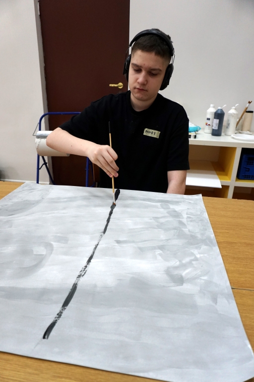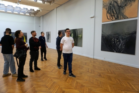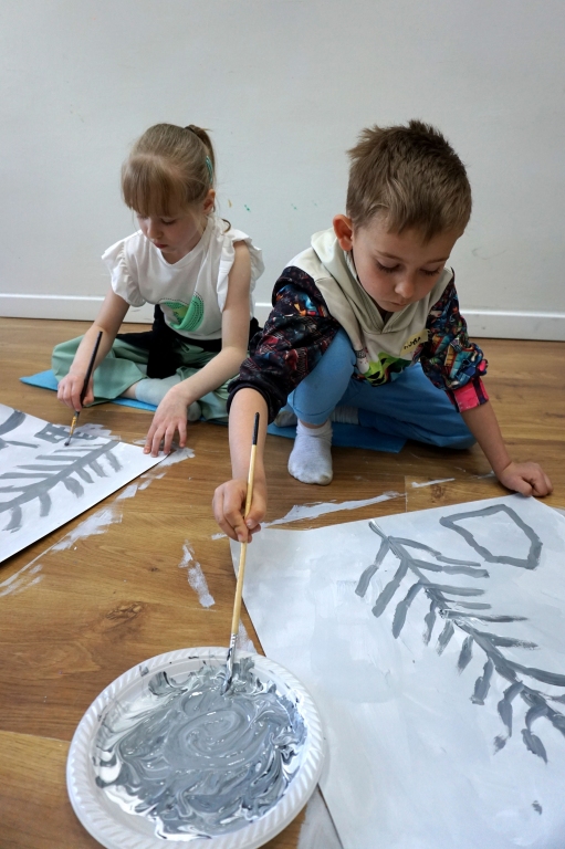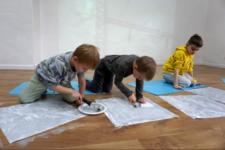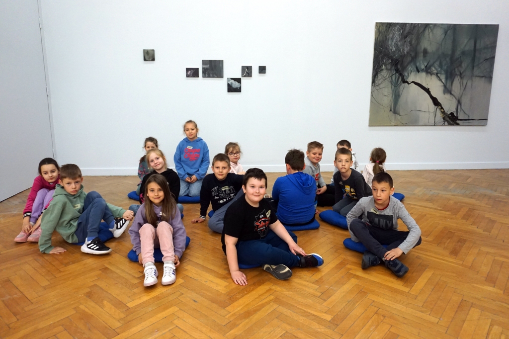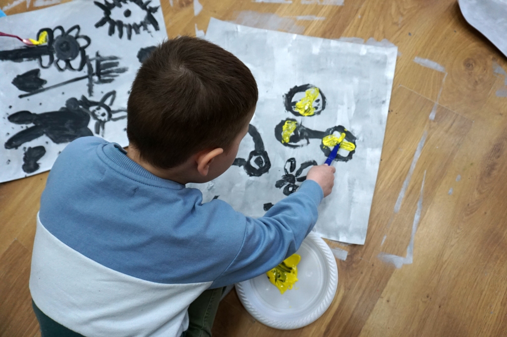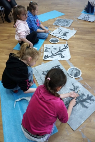 Podczas kolejnych warsztatów SZTUKowanie uczestnicy zwiedzili wystawę Andrzeja Bembenka. Poznali termin abstrakcja, malarstwo ekspresjonistyczne, impast oraz akcent. Następnie stworzyli swoje dzieła malarskie przedstawiające linearne fragmenty naszeg krajobrazu: drzewa, linie wysokiego napięcia, żurawie, mosty, trakcje. Używali do tego celu różnych narzędzi malarskich: wałka, pędzla i szpachelki, którą stworzyli impastowy akcent na obrazie.