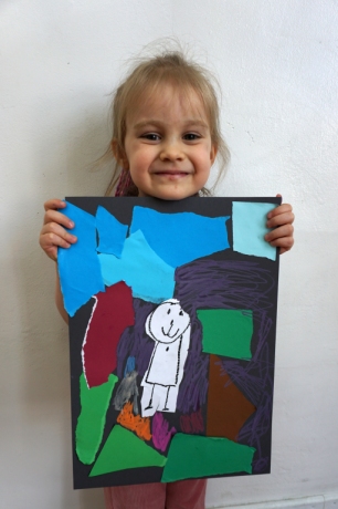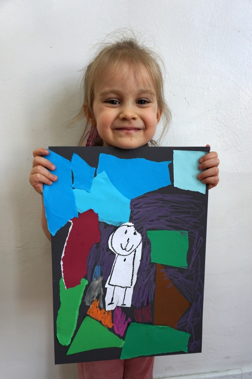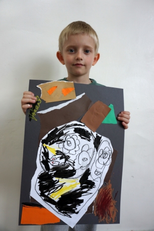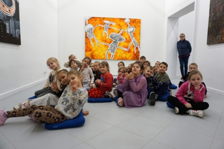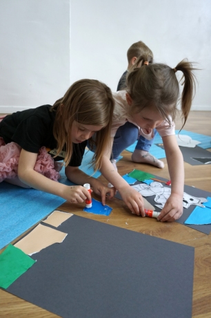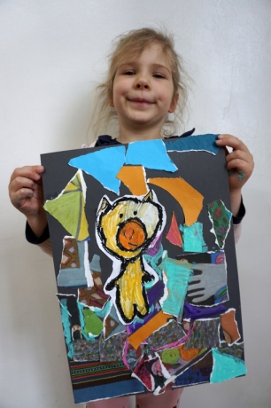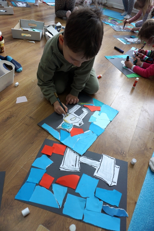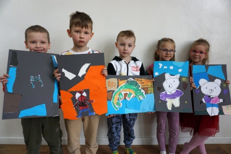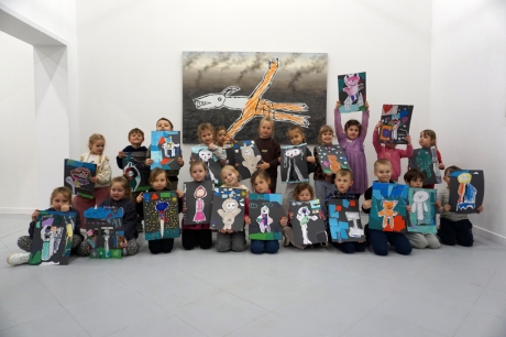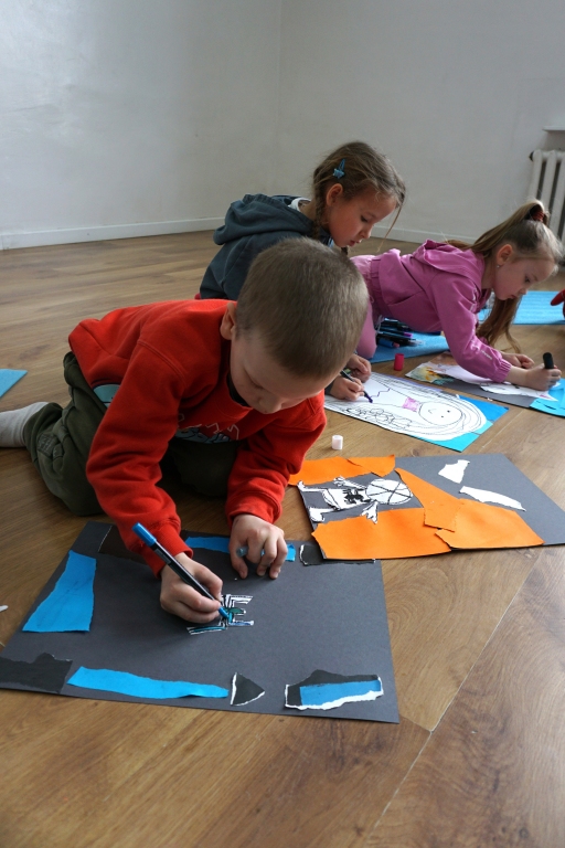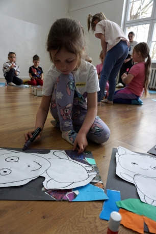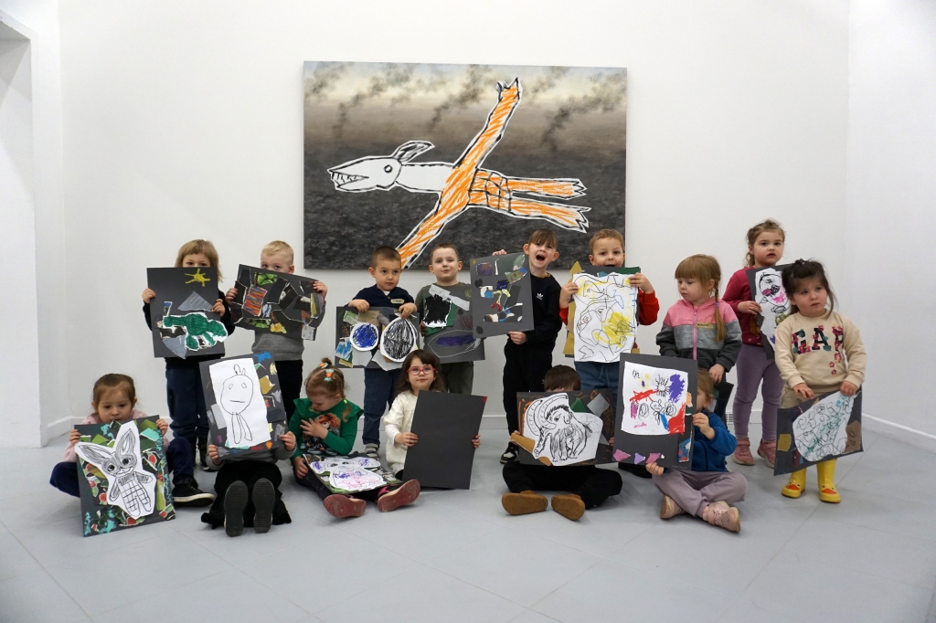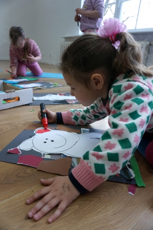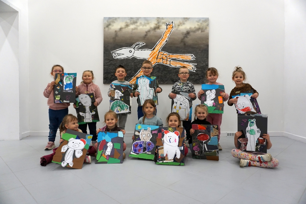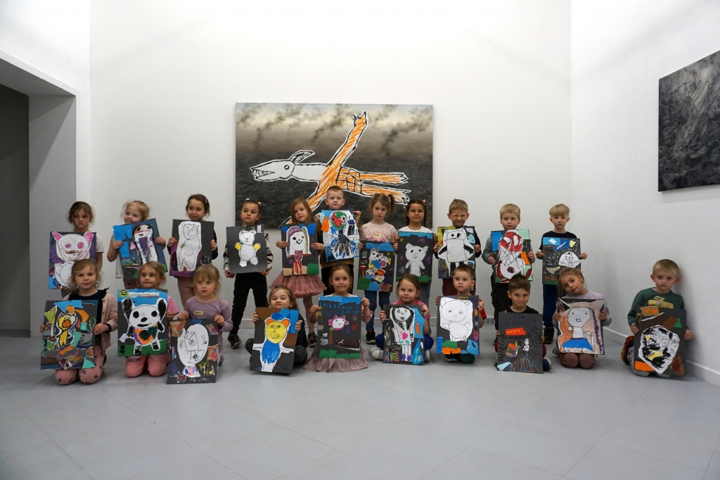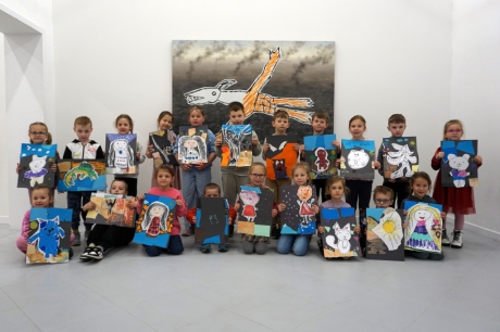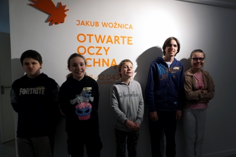 Wystawa Jakuba Woźnicy stała się inspiracją do kolejnych warsztatów SZTUKowanie. Dzieci zwiedziły wystawę artysty pt. "Otwarte oczy schną". Dowiedziały się o metodach pracy, technikach i tematach prac twórcy. Następnie narysowały swoje ulubione postaci z bajek i filmów przyklejając je na tło z wydzieranych papierów. Powstały niesamowite wielobarwne kolaże nawiązujące do prac Jakuba Woźnicy.