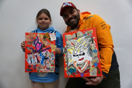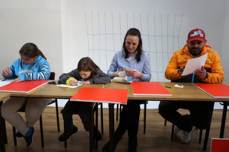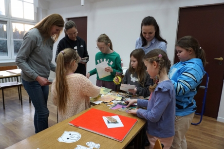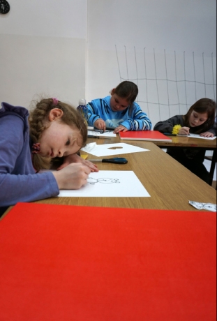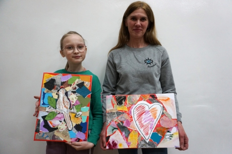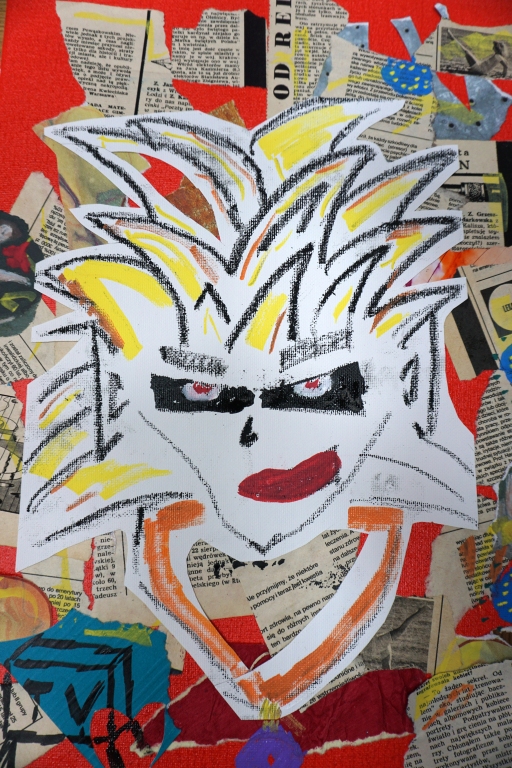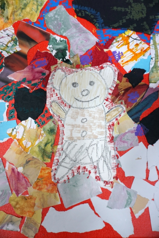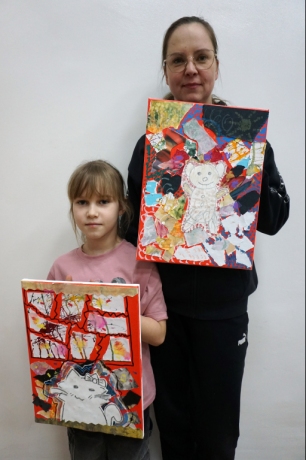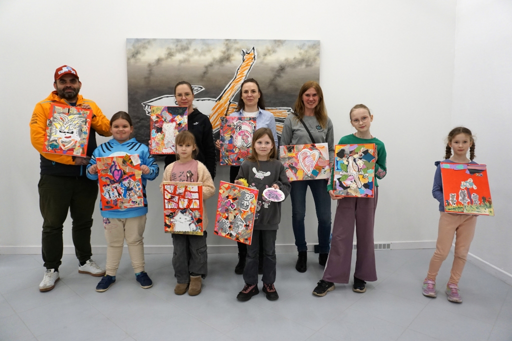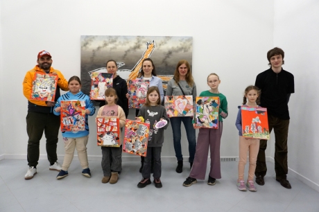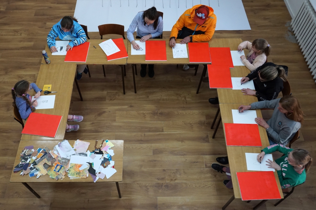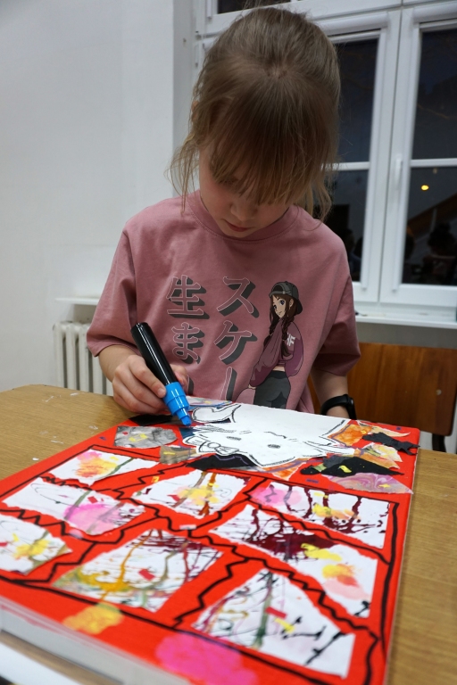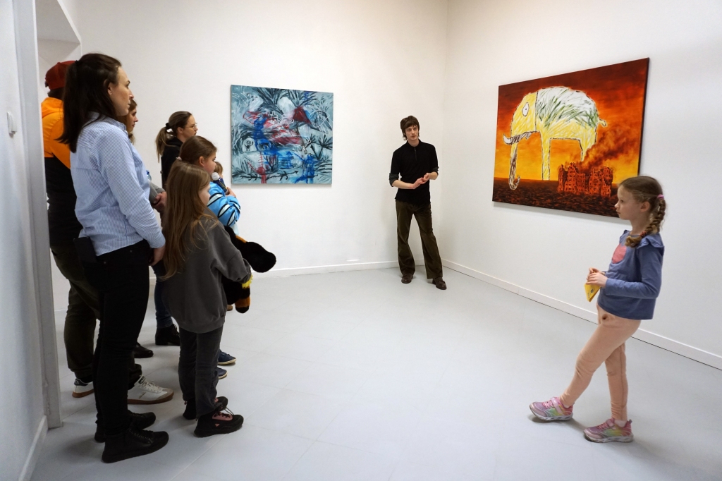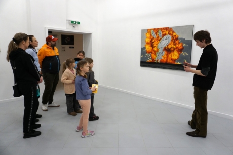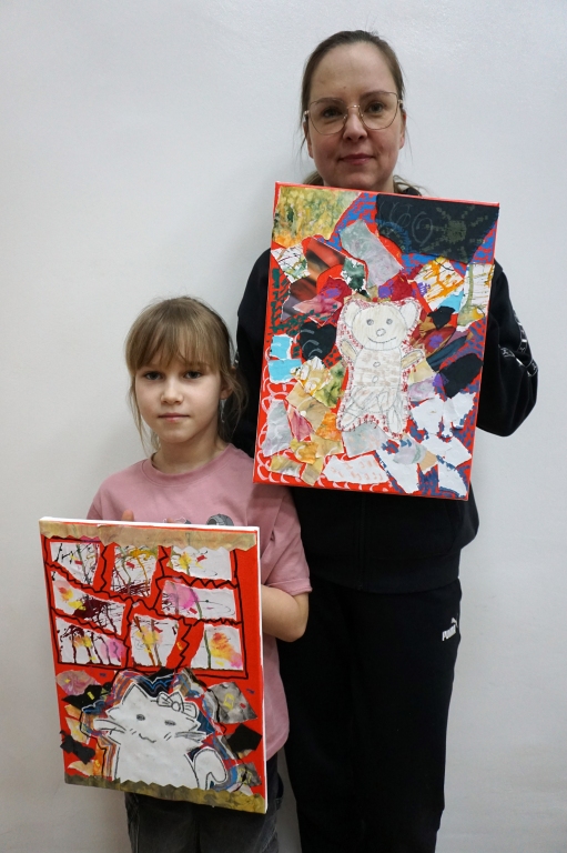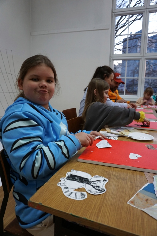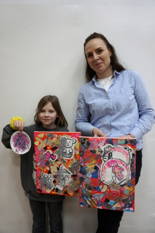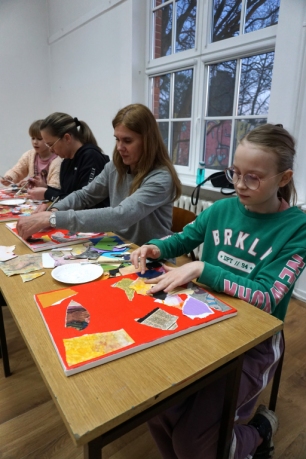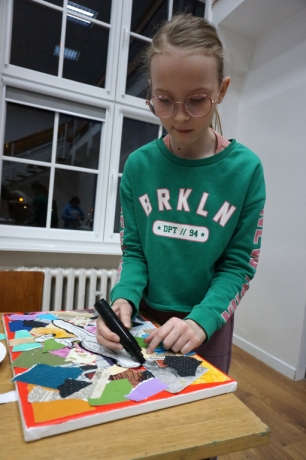 Podczas ostatnich warsztatów dzieci i ich rodzice zostali oprowadzeni po wystawie pt. "Otwarte oczy schną" przez samego artystę Jakuba Woźnicę, który opowiedział o swoich pracach i swoich inspiracjach. Połączenie dziecięcych rysunków i współczesnej historii oraz techniki pracy artysty tj. zdzierania różnobarwnych papierów, stały się motywem pracy twórczej uczestników. Powstały wielobarwne kolaże na płótnie z elementami rysunku przedstawiające ulubione postaci dzieci i z dzieciństwa rodziców.