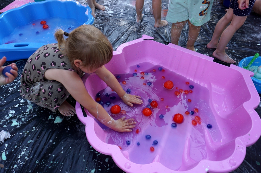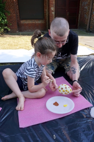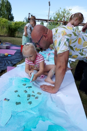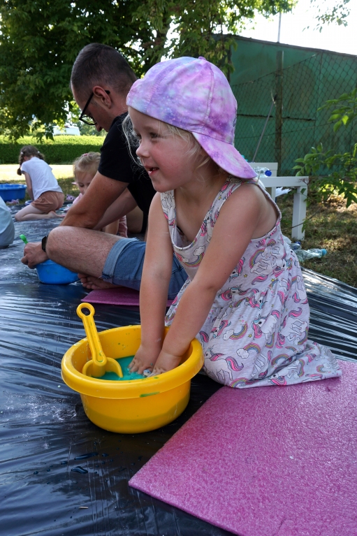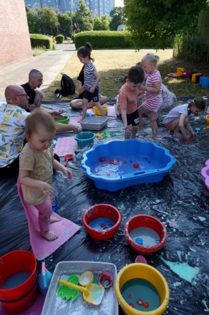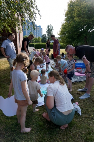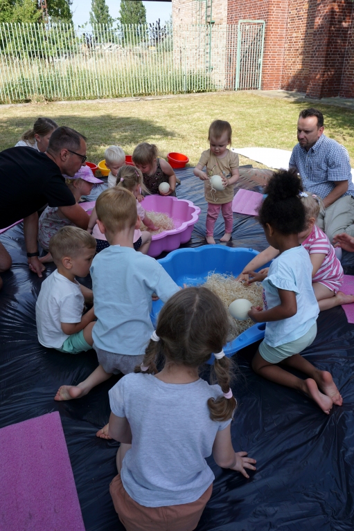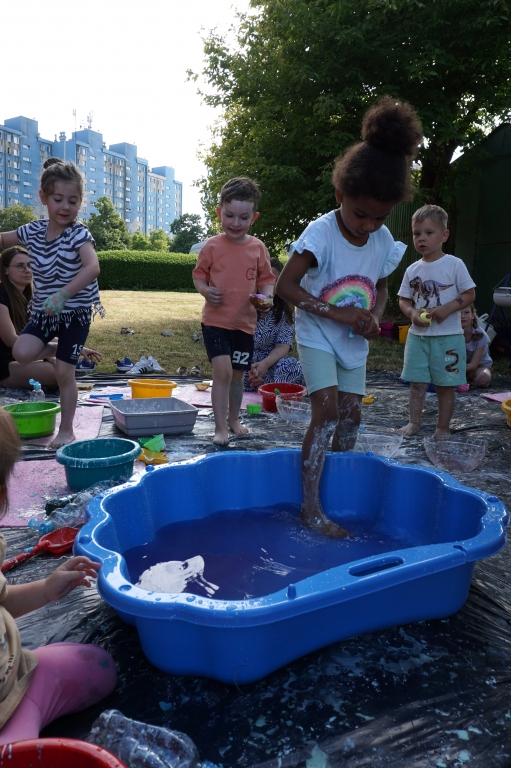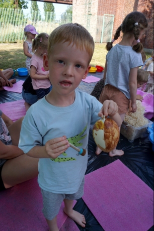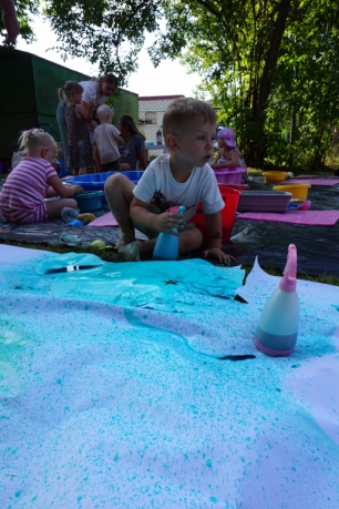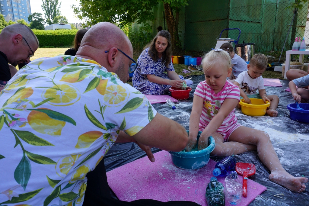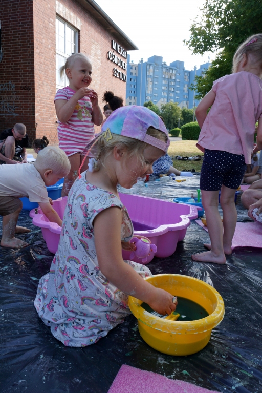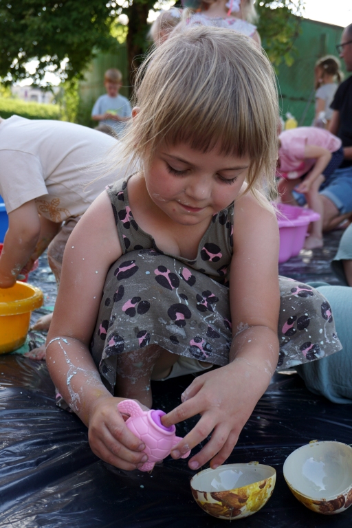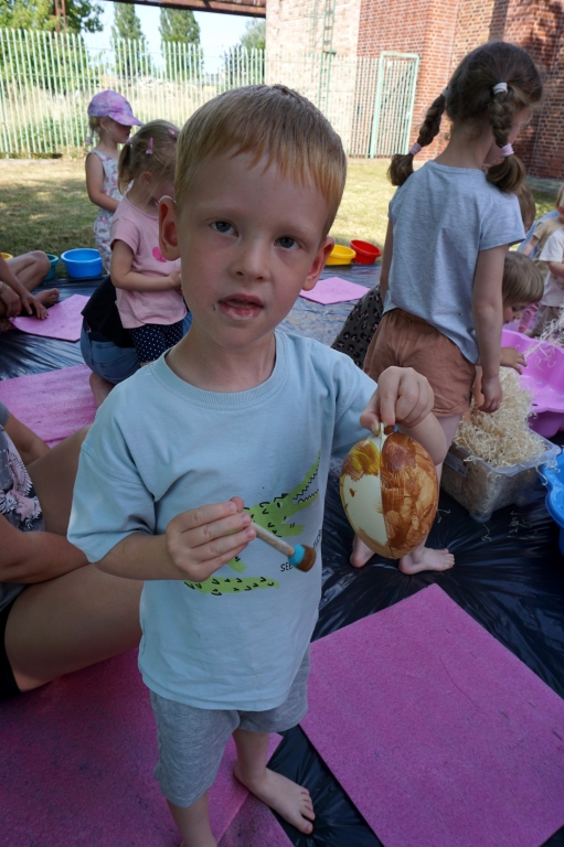 Ostatnie w tym roku szkolnym SZTUKowanki dedykowane najmłodszym, czyli dzieciom do lat 4, odbyły się na dworze. Dzieci znalazły duże jaja, które pomalowały, następnie zrobiły niebiesko-zieloną ciecz nienewtonowską z kolorowymi kostkami lodu. Kiedy z jaj wyciągnęły morskie żółwie zabawa przeniosła się do baseników, żeby sprawdzić czy żółwie pływają. Ostatnim elementem tworzenia było malowanie papierowych żółwi spryskiwaczami z wodną farbą.