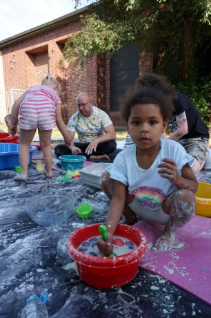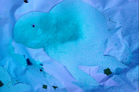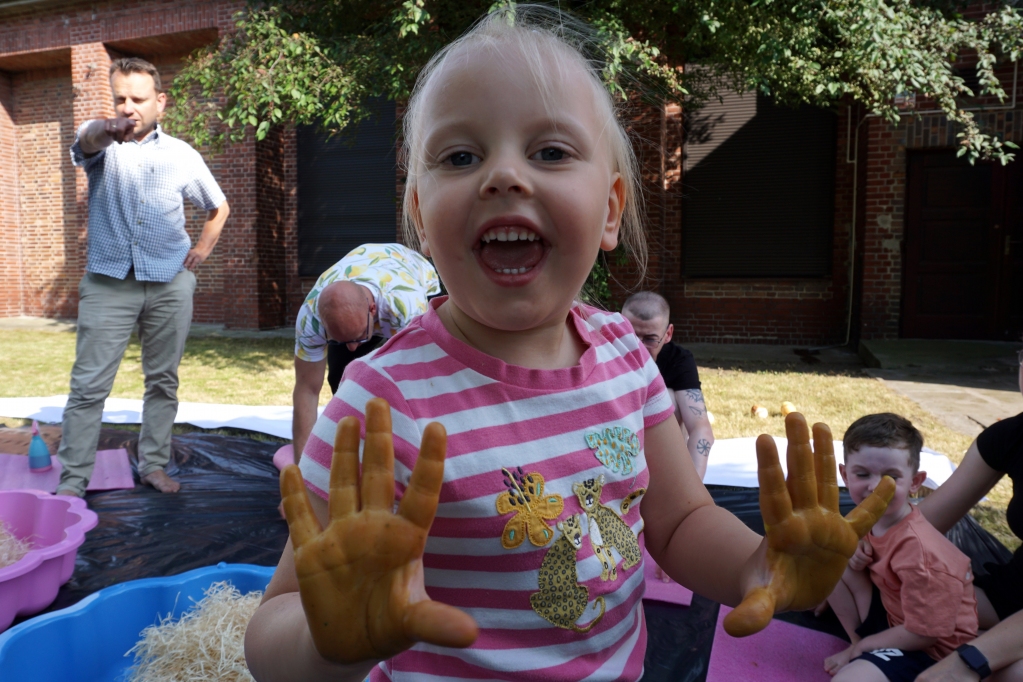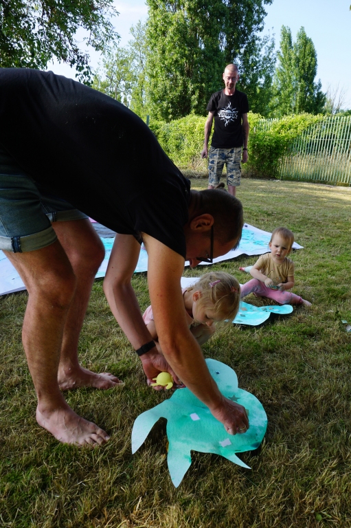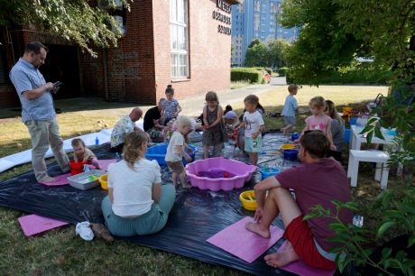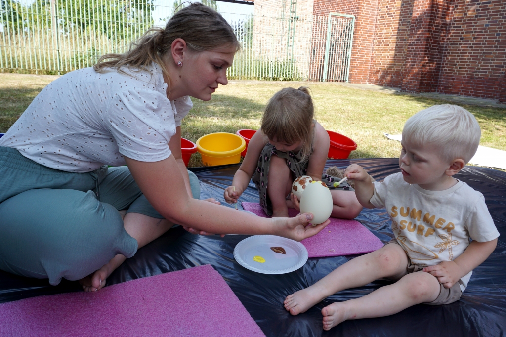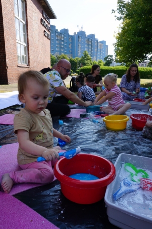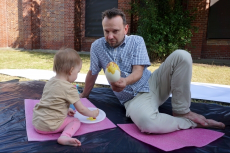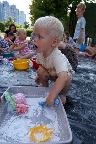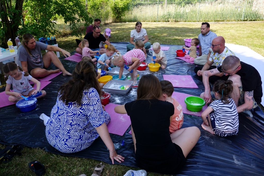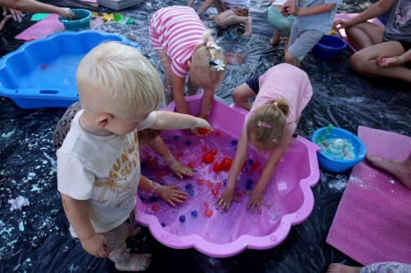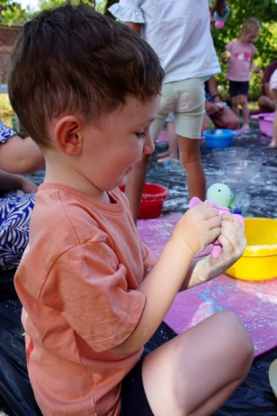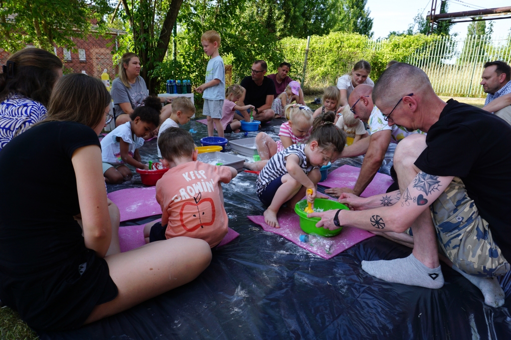 Ostatnie w tym roku szkolnym SZTUKowanki dedykowane najmłodszym, czyli dzieciom do lat 4, odbyły się na dworze. Dzieci znalazły duże jaja, które pomalowały, następnie zrobiły niebiesko-zieloną ciecz nienewtonowską z kolorowymi kostkami lodu. Kiedy z jaj wyciągnęły morskie żółwie zabawa przeniosła się do baseników, żeby sprawdzić czy żółwie pływają. Ostatnim elementem tworzenia było malowanie papierowych żółwi spryskiwaczami z wodną farbą.