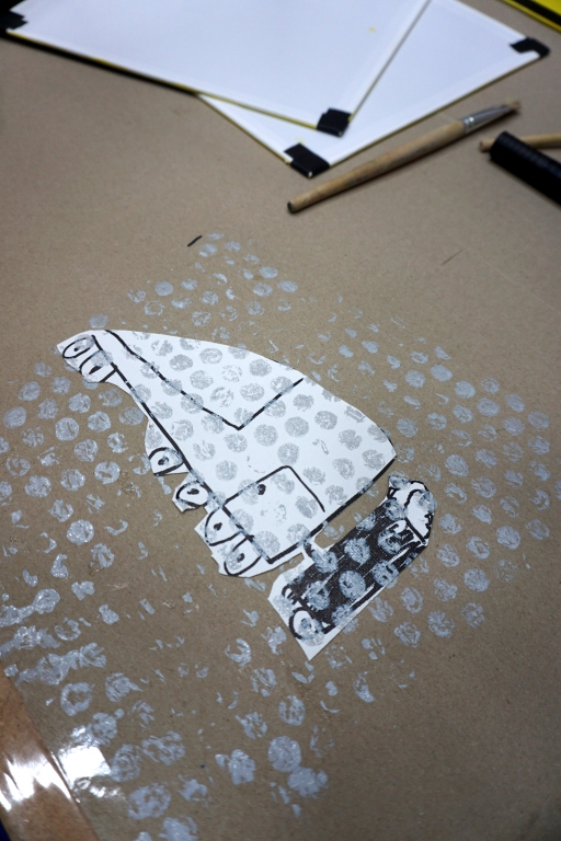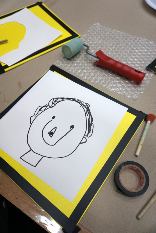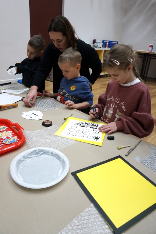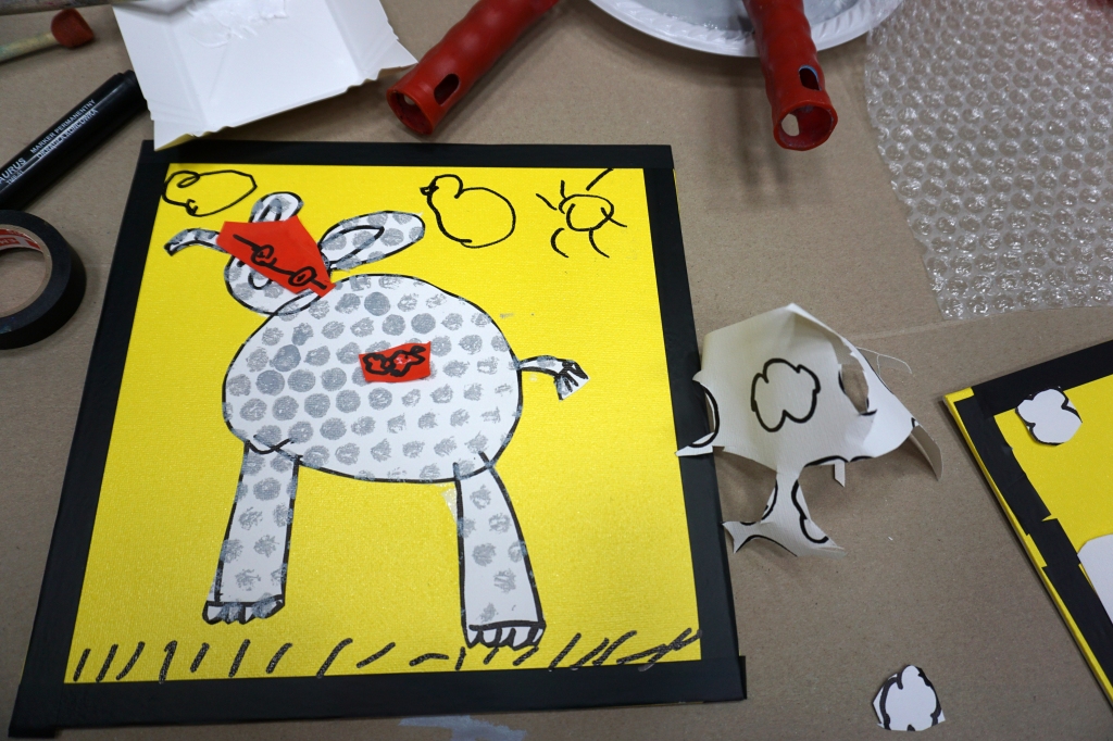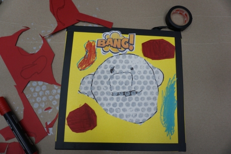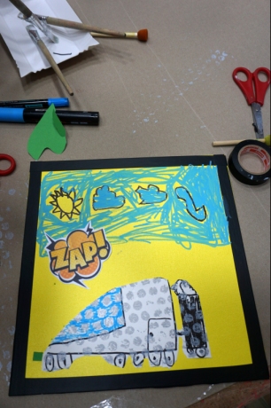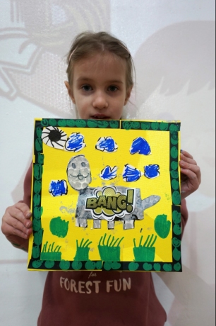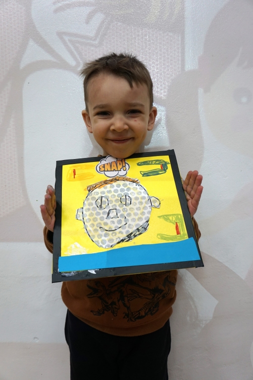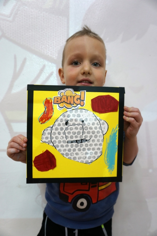 Podczas zajęć dzieci stworzyły prace w komiksowym stylu z ramkami/okienkami z taśmy izolacyjnej, rastrem z folii bąbelkowej i kolorowymi dymkami z napisami. Na płótnach powstały portrety dziadków, Songa, Owena z Parku Jurajskiego, słonia, kota i auta. Dziękuję za kolejne twórcze spotkanie.