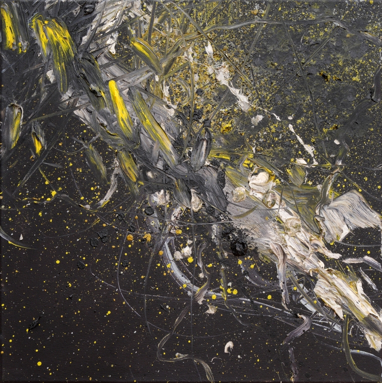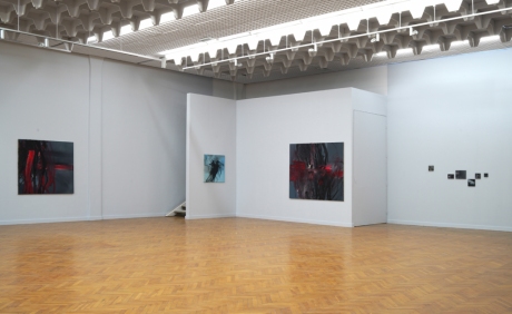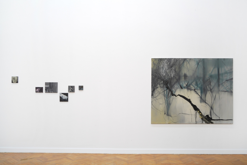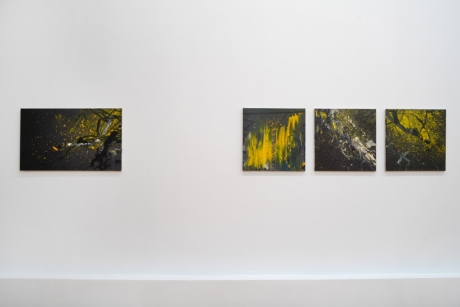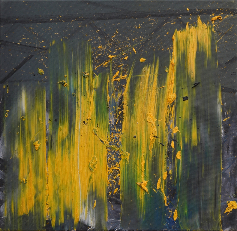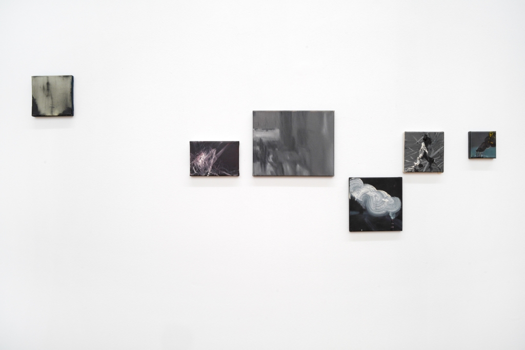 Andrzej Bembenek, od lewej: W drodze na miejsce, 15 x 15cm, olej olej na płótnie, 2019; „….” 13 x 18 cm, olej na płótnie, 2023; NRD, 20 x 30 cm, olej na płótnie, 2018; Spróbowałem sobie to wyobrazić,20 x 20 cm, olej na płótnie, 2017; „...”- 15 x 15 cm, ol
